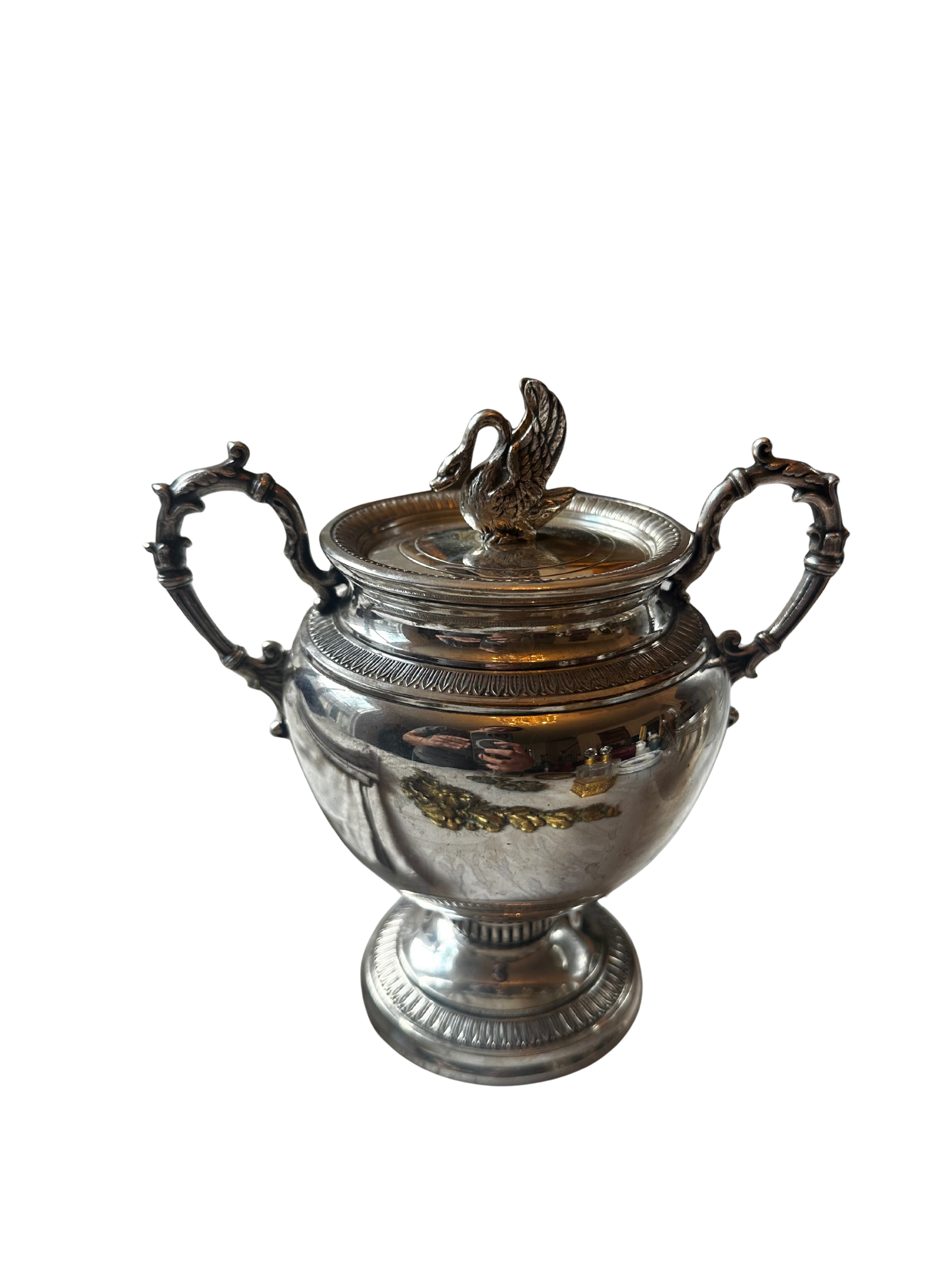 Late 19th / Early 20th C Silverplate Swan Double Handle Lidded Sugar Bowl / Urn