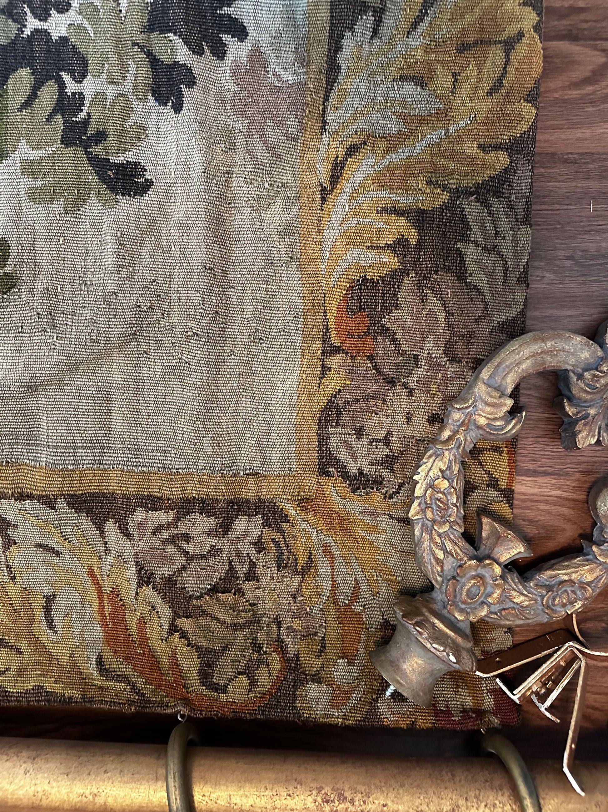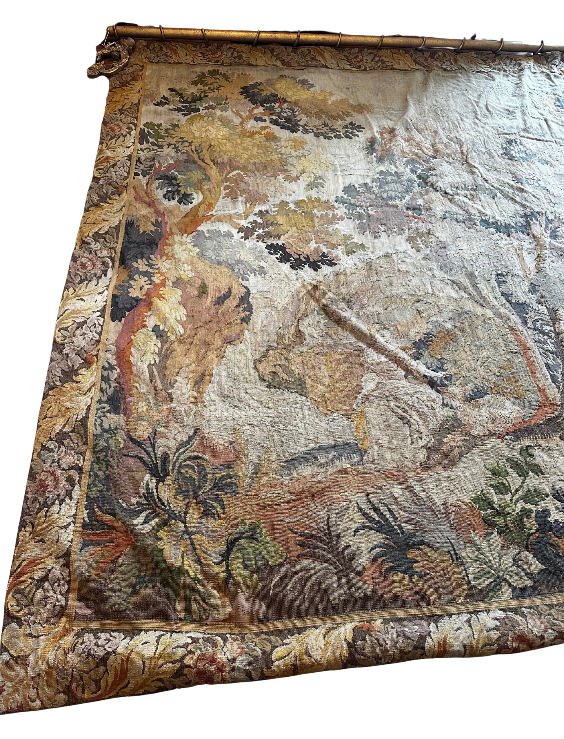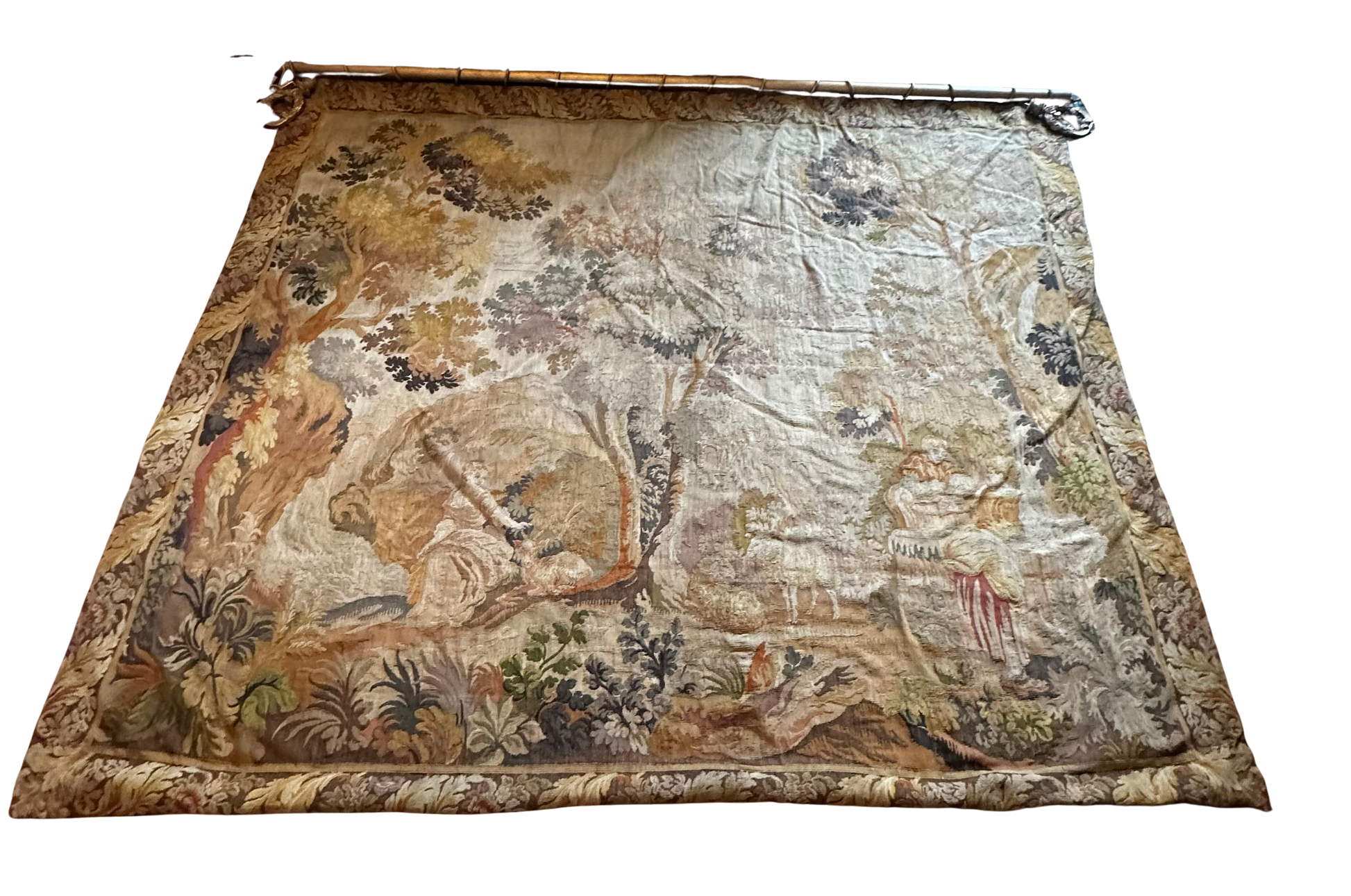 Monumental French Aubusson Style Verdure Woven tapestry, 19th century, with pastoral figures and livestock beneath a woodland canopy — woven in wool and silk and mounted on a giltwood rod with cast composite scrolled finials. Beautiful age patina and authentic historic wear. Lined and ready to hang.