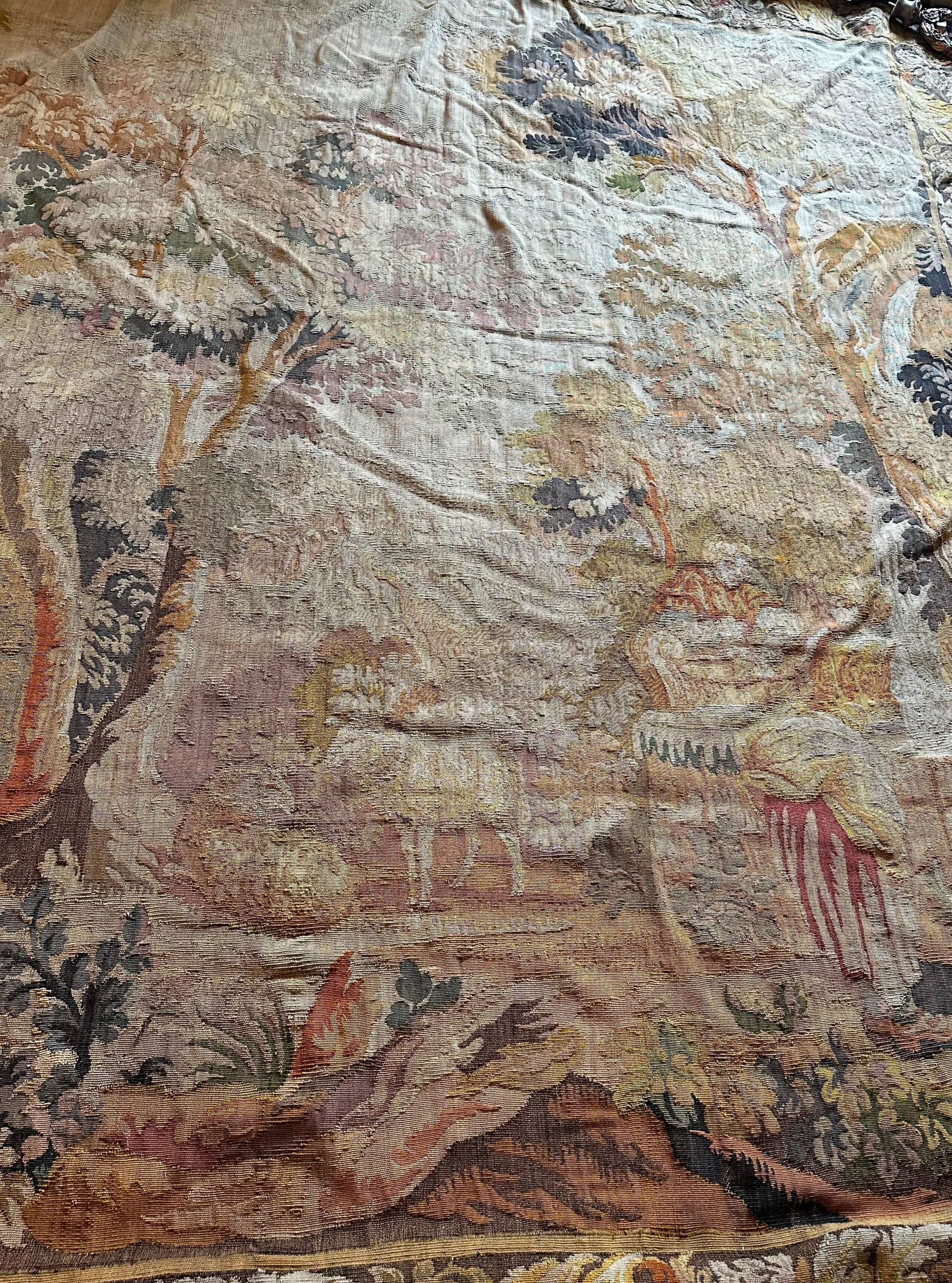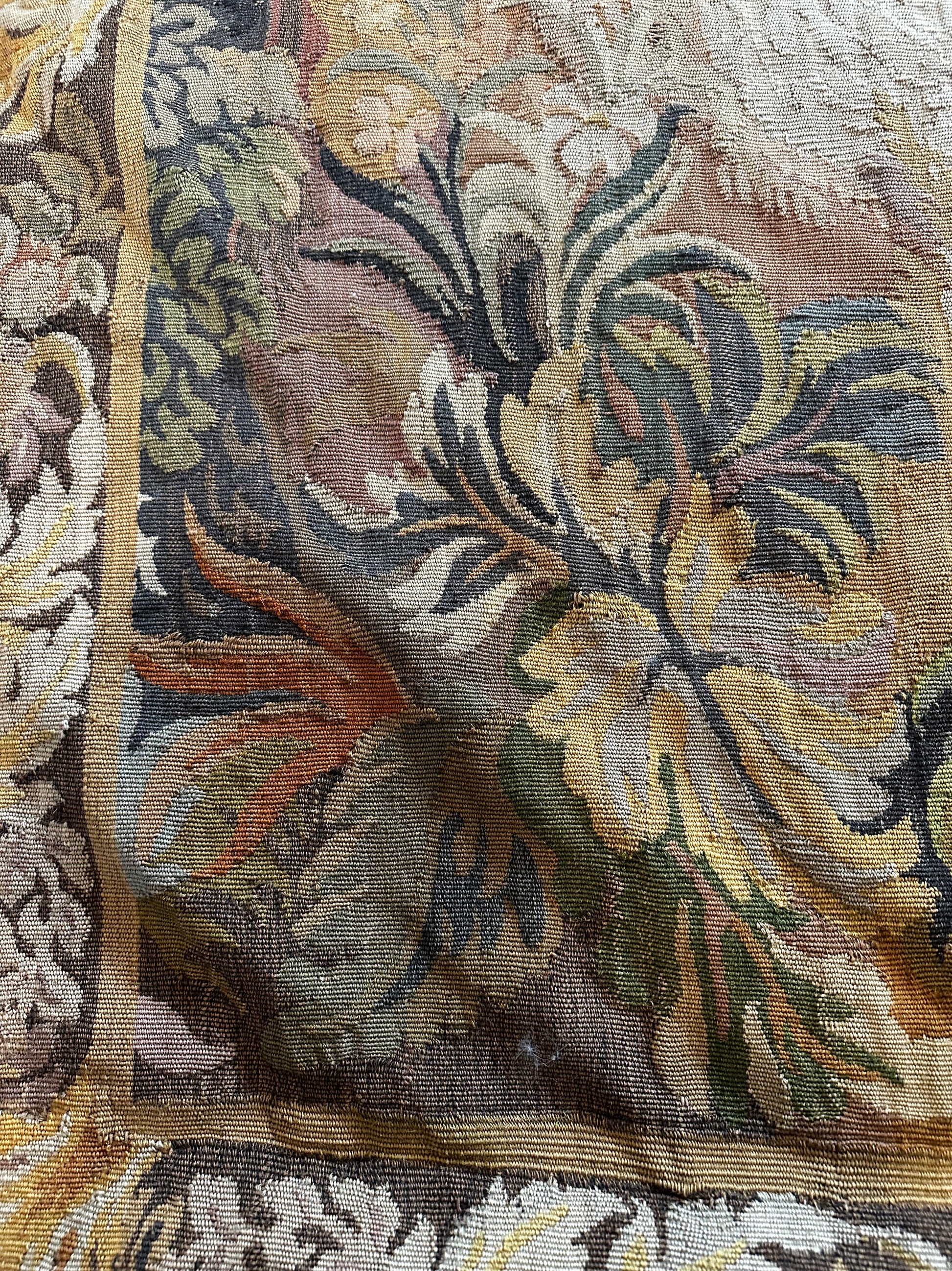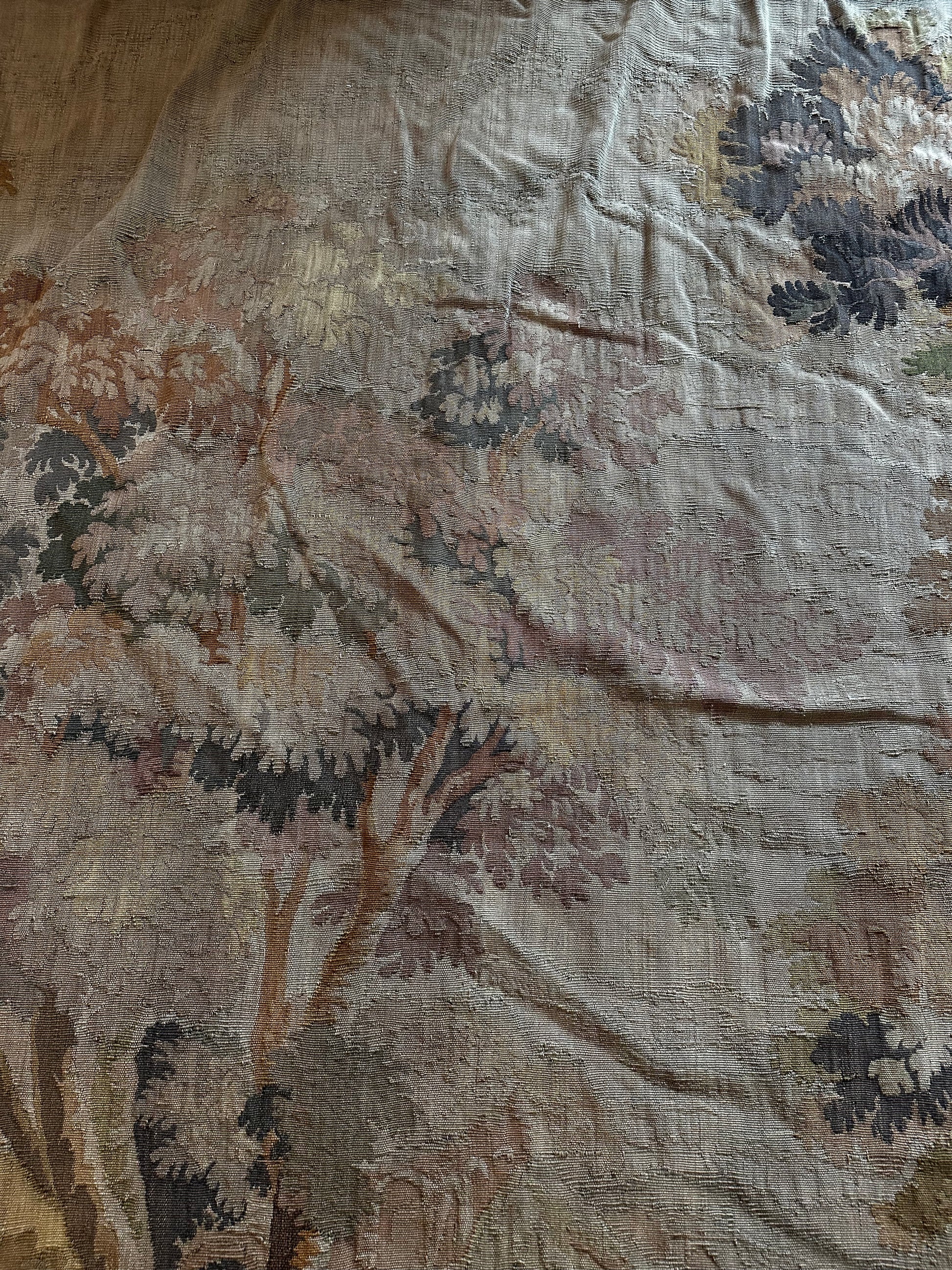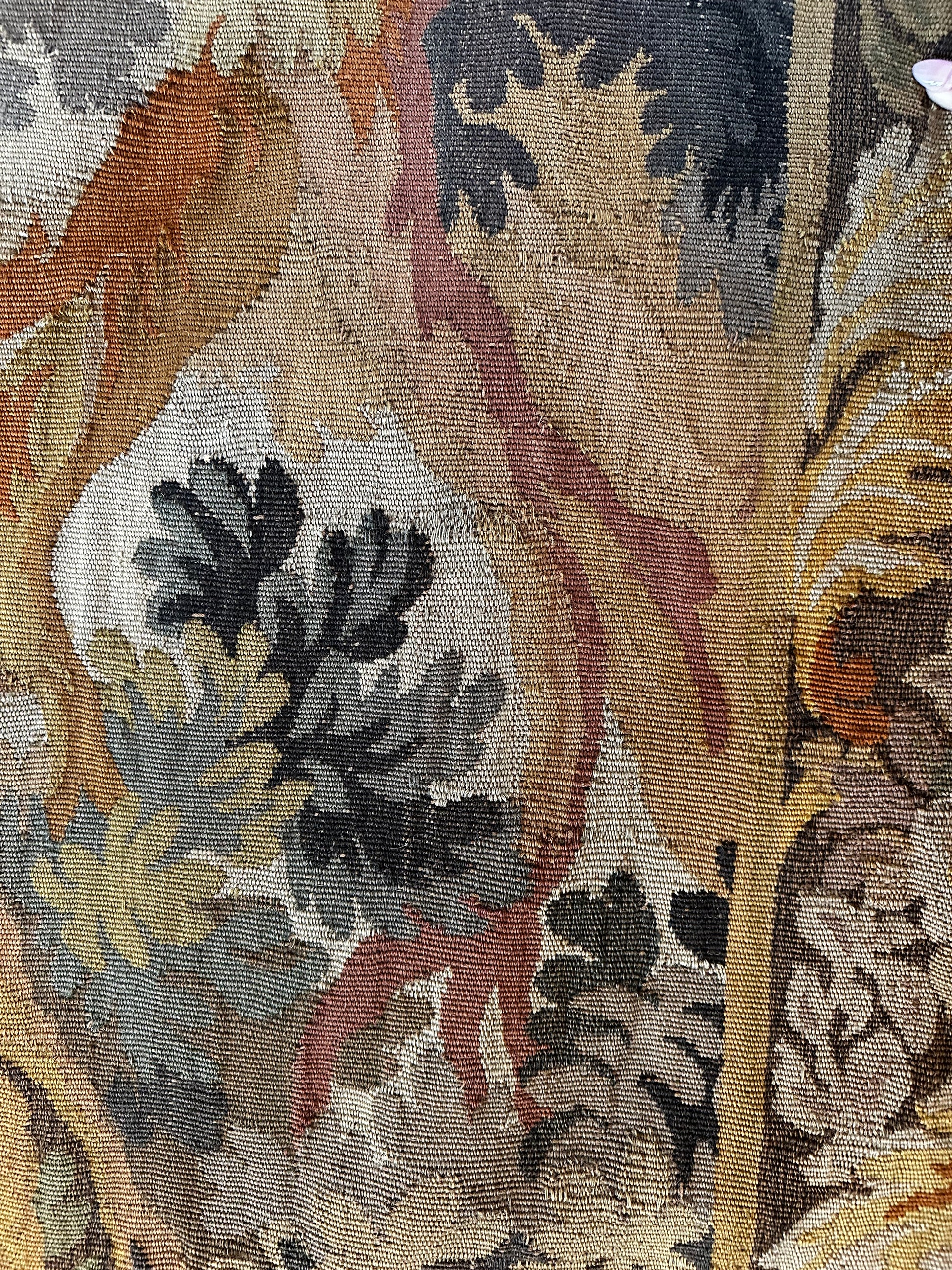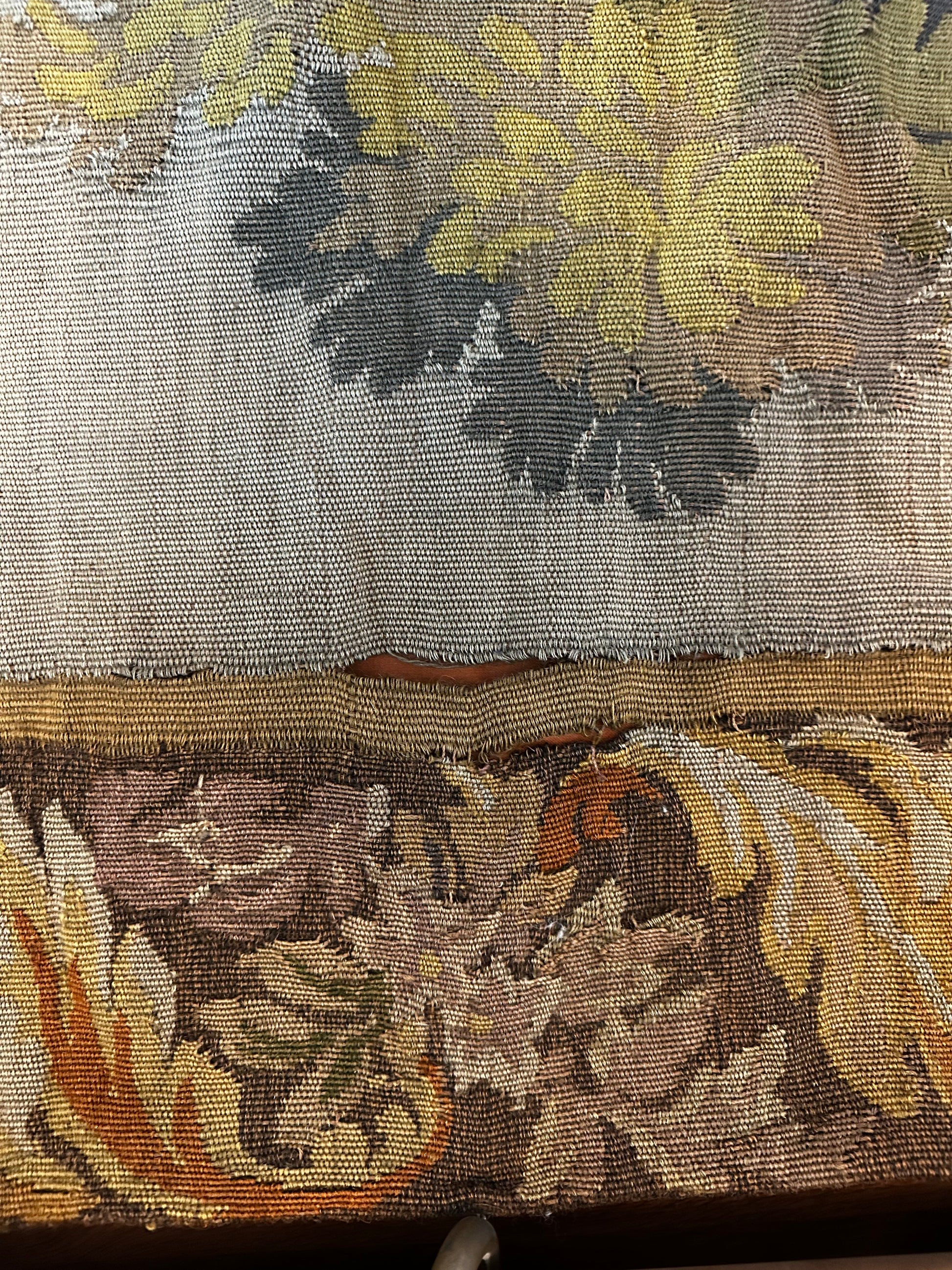 The tapestry has a conservation lining on the back and there are several places where holes are present due to the age of the tapestry, as depicted in photos.
