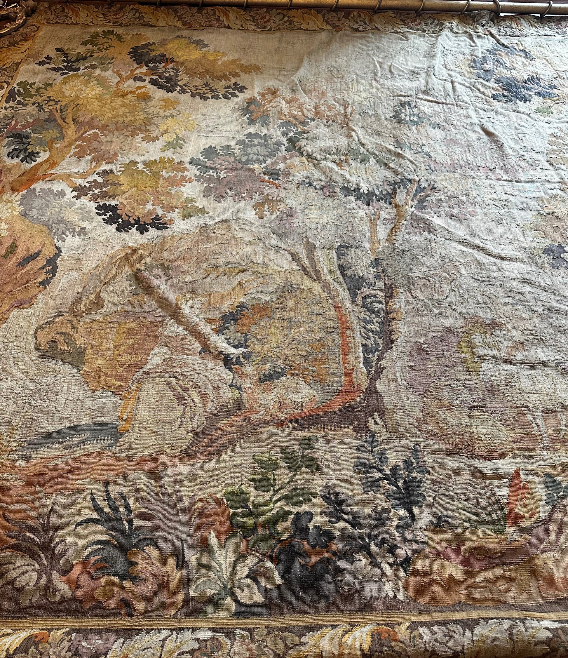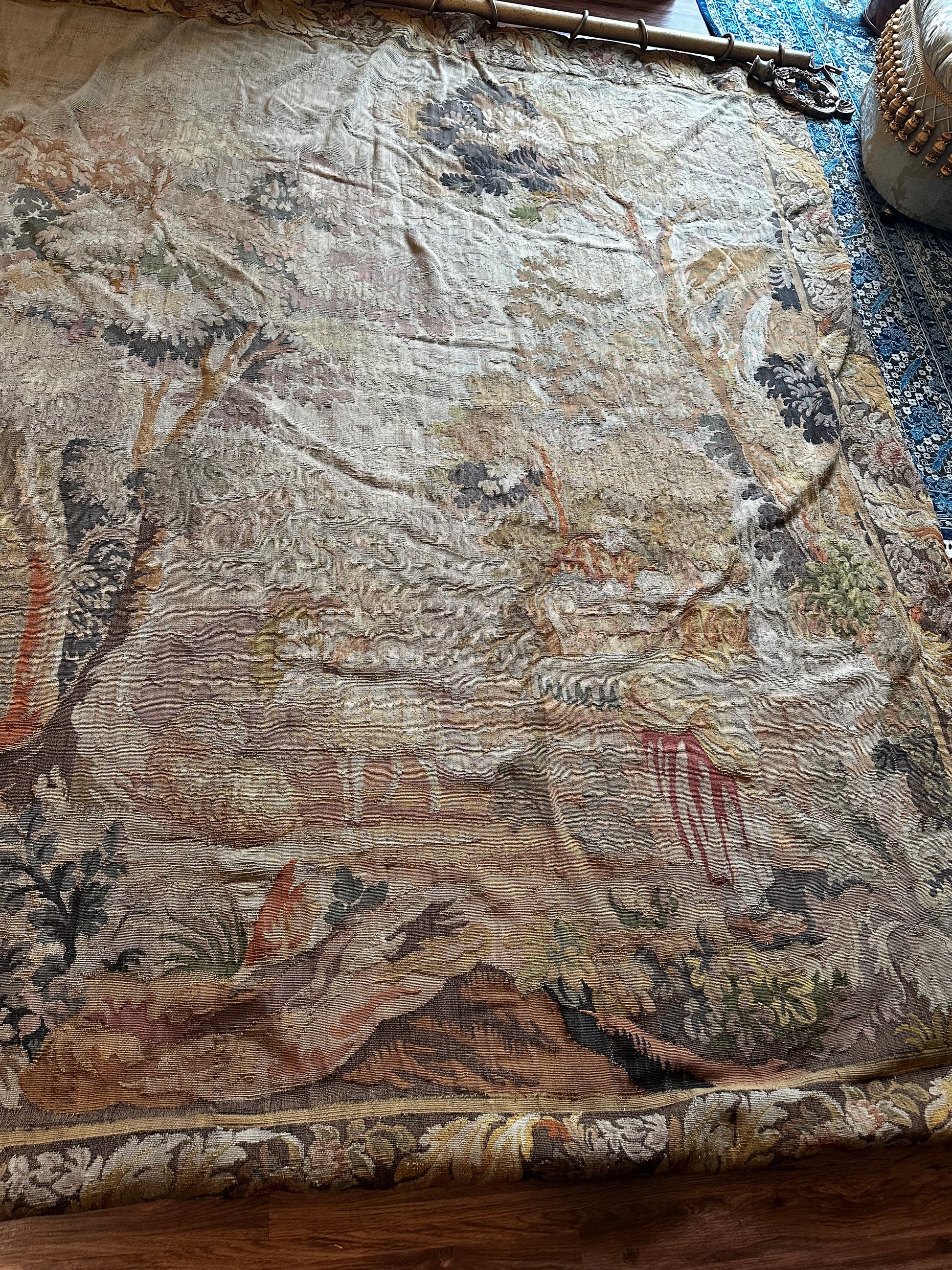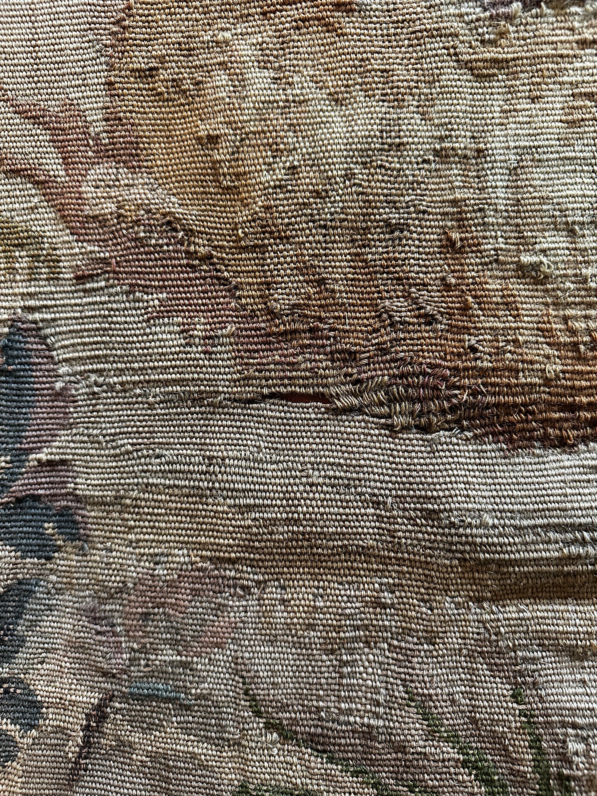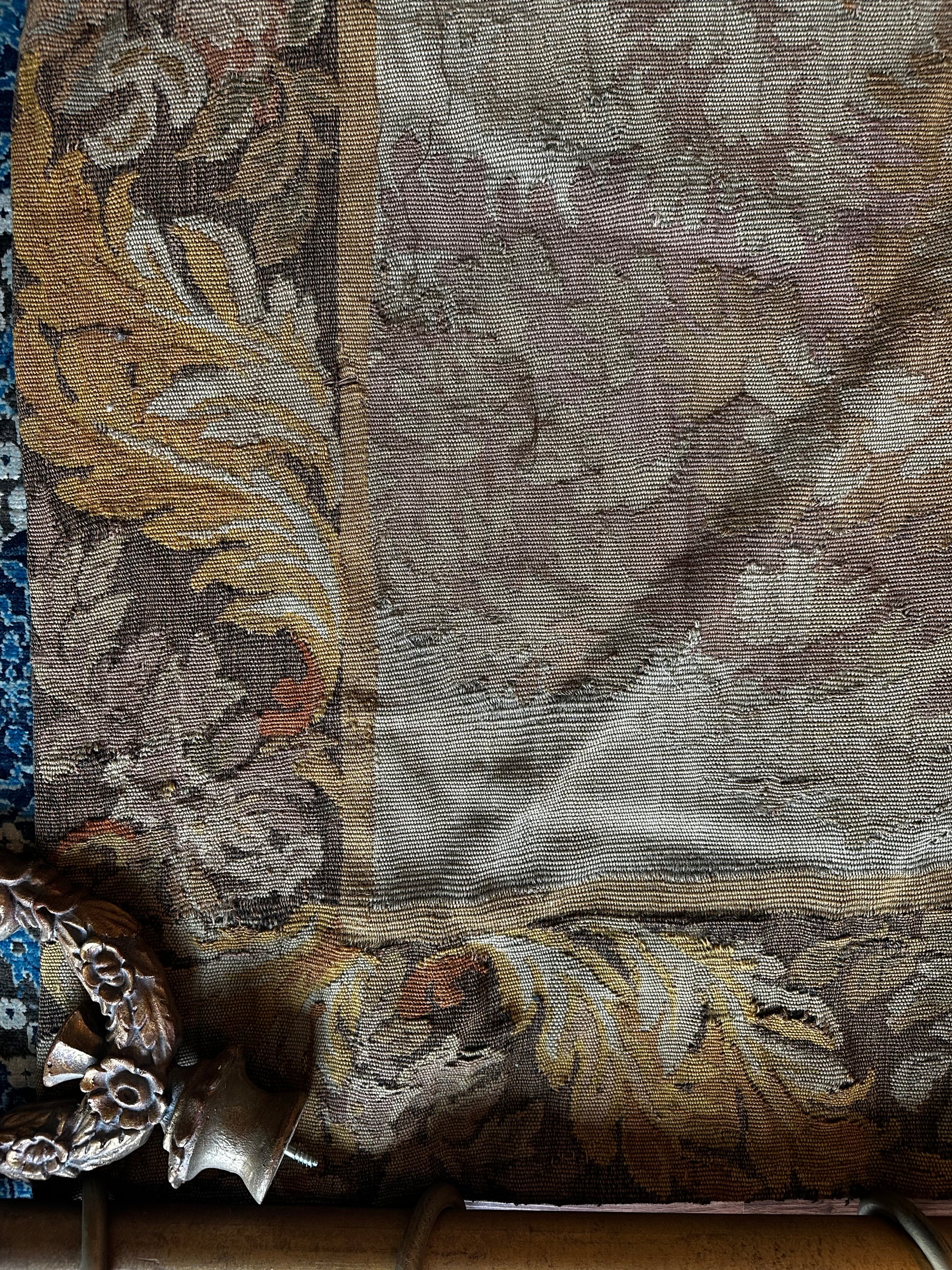 The tapestry has a conservation lining on the back and there are several places where holes are present due to the age of the tapestry, as depicted in photos.