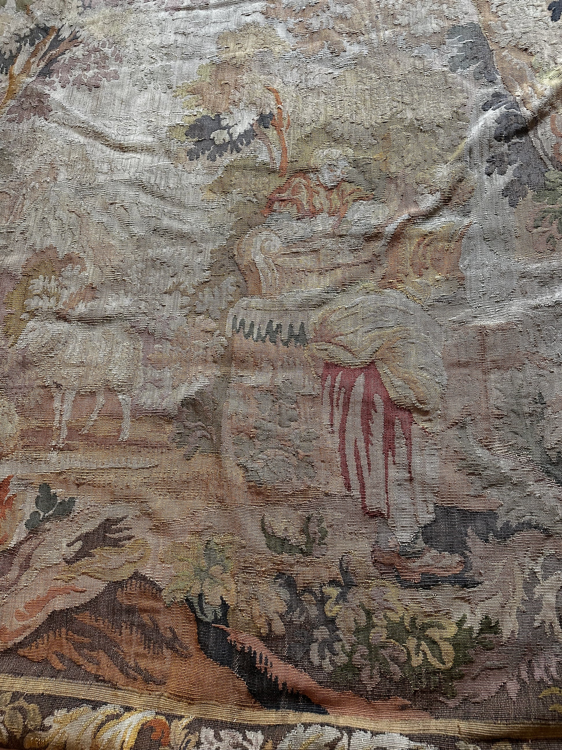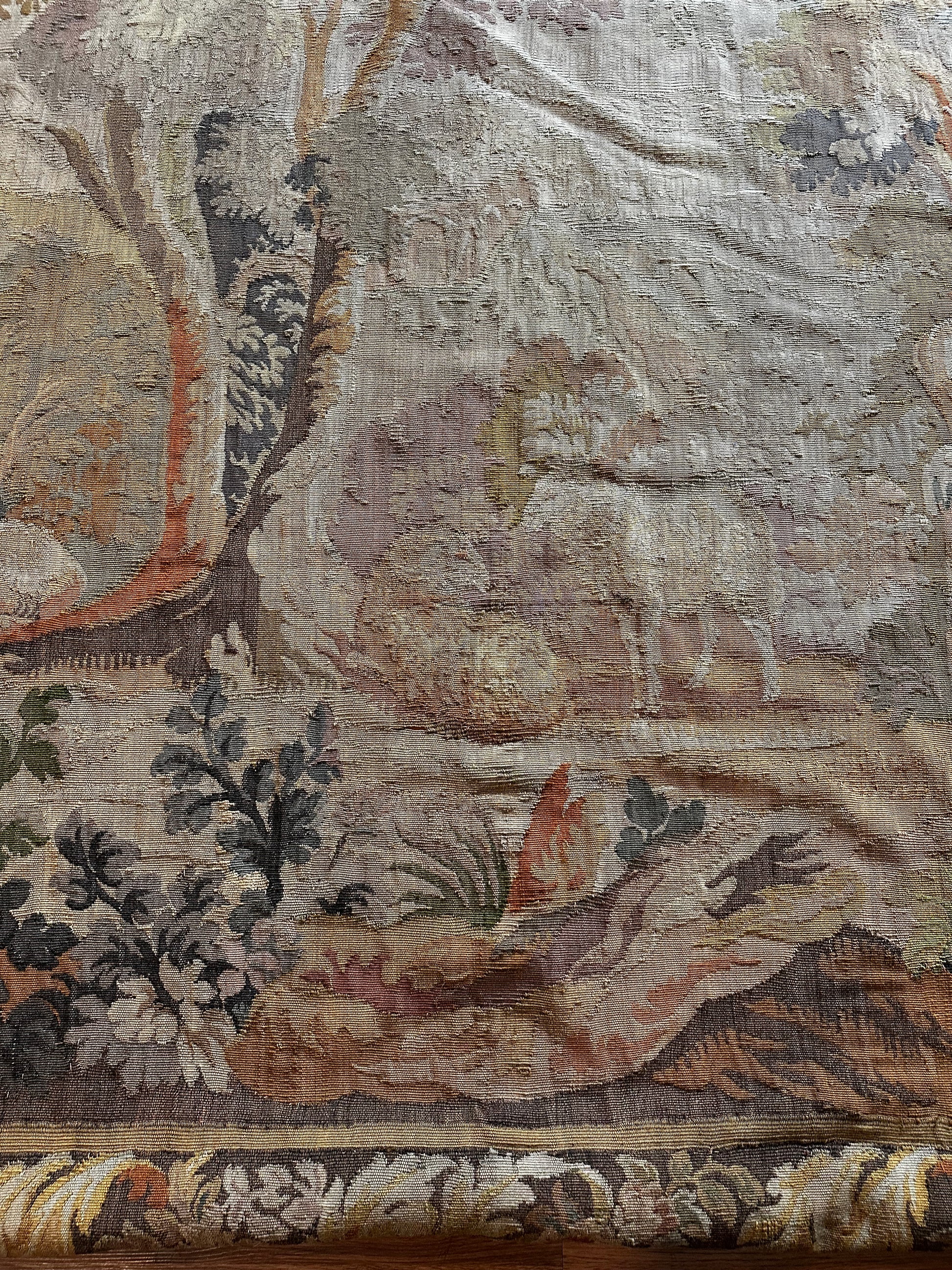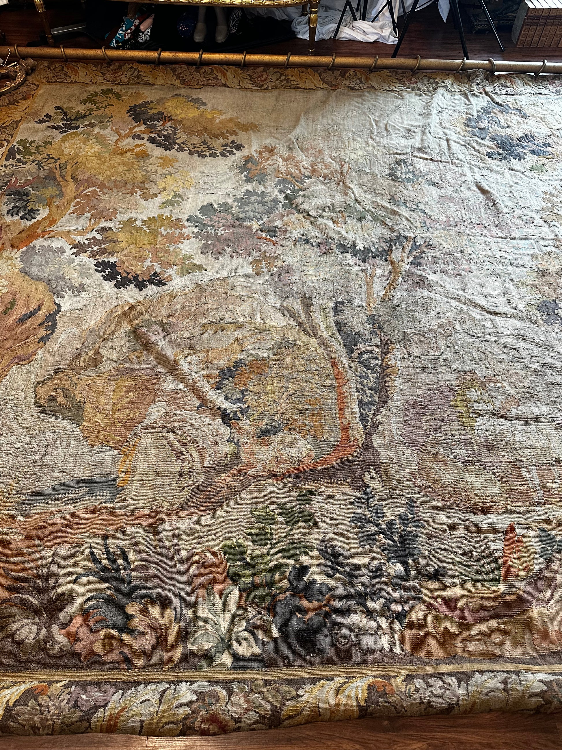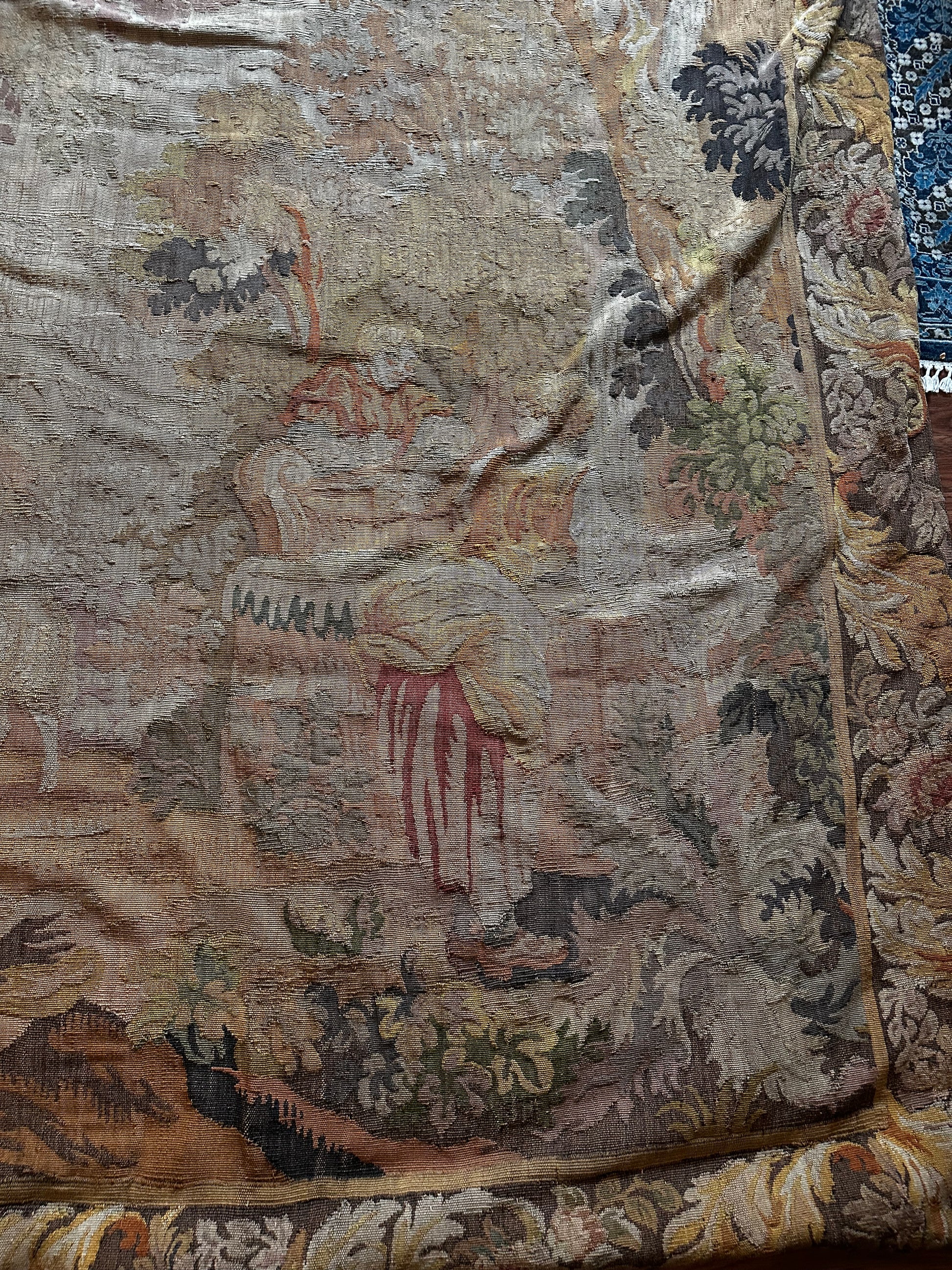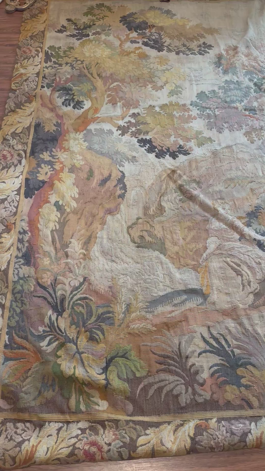 The tapestry has a conservation lining on the back and there are several places where holes are present due to the age of the tapestry, as depicted in photos.