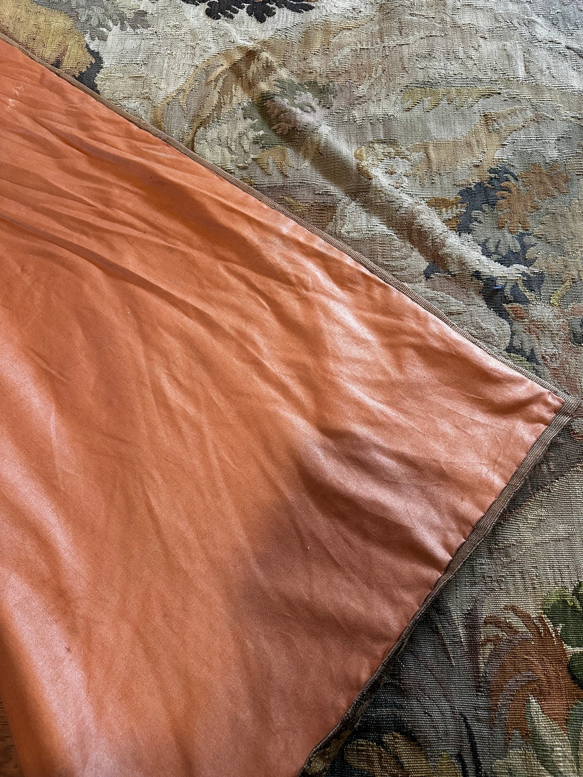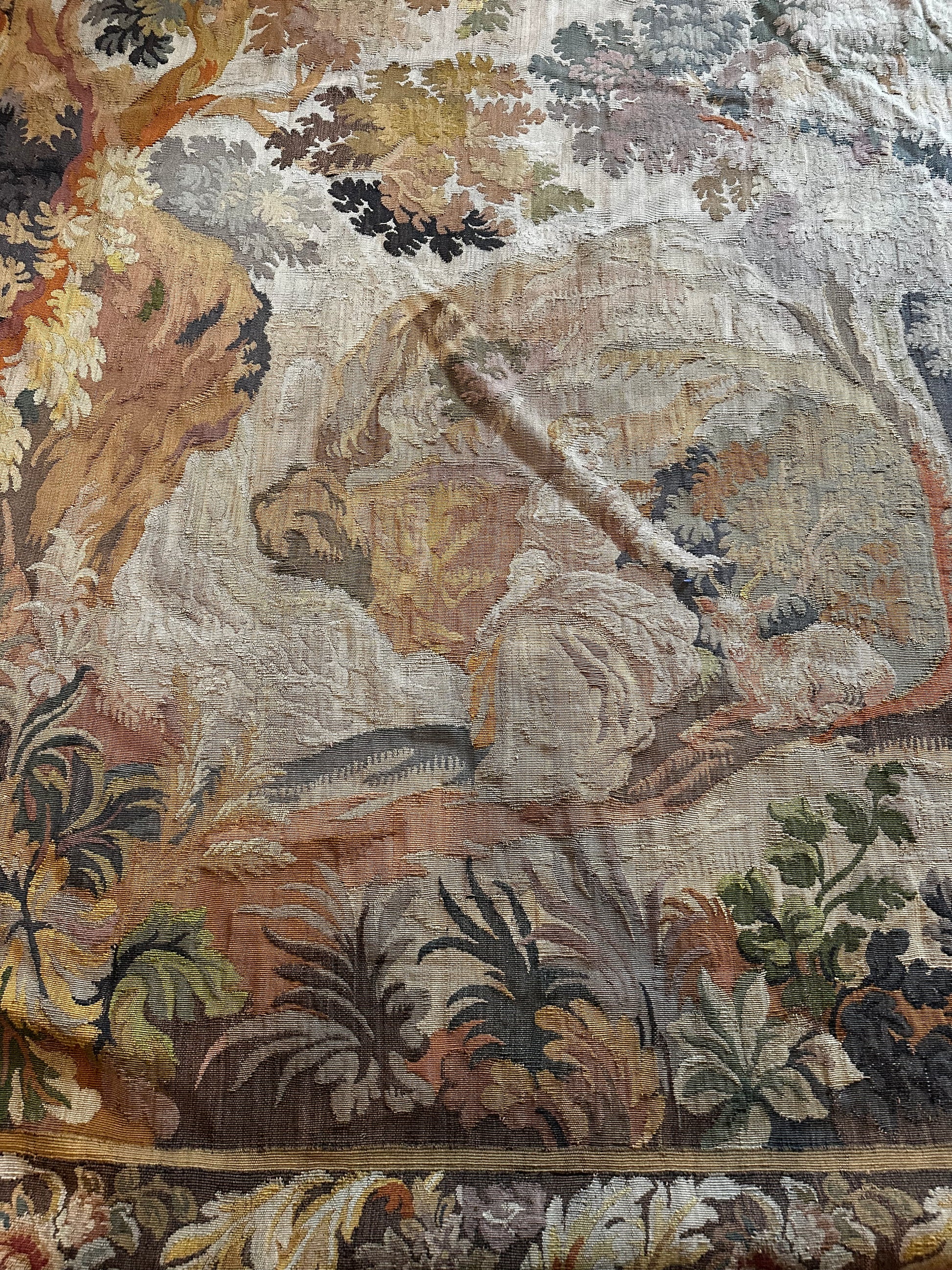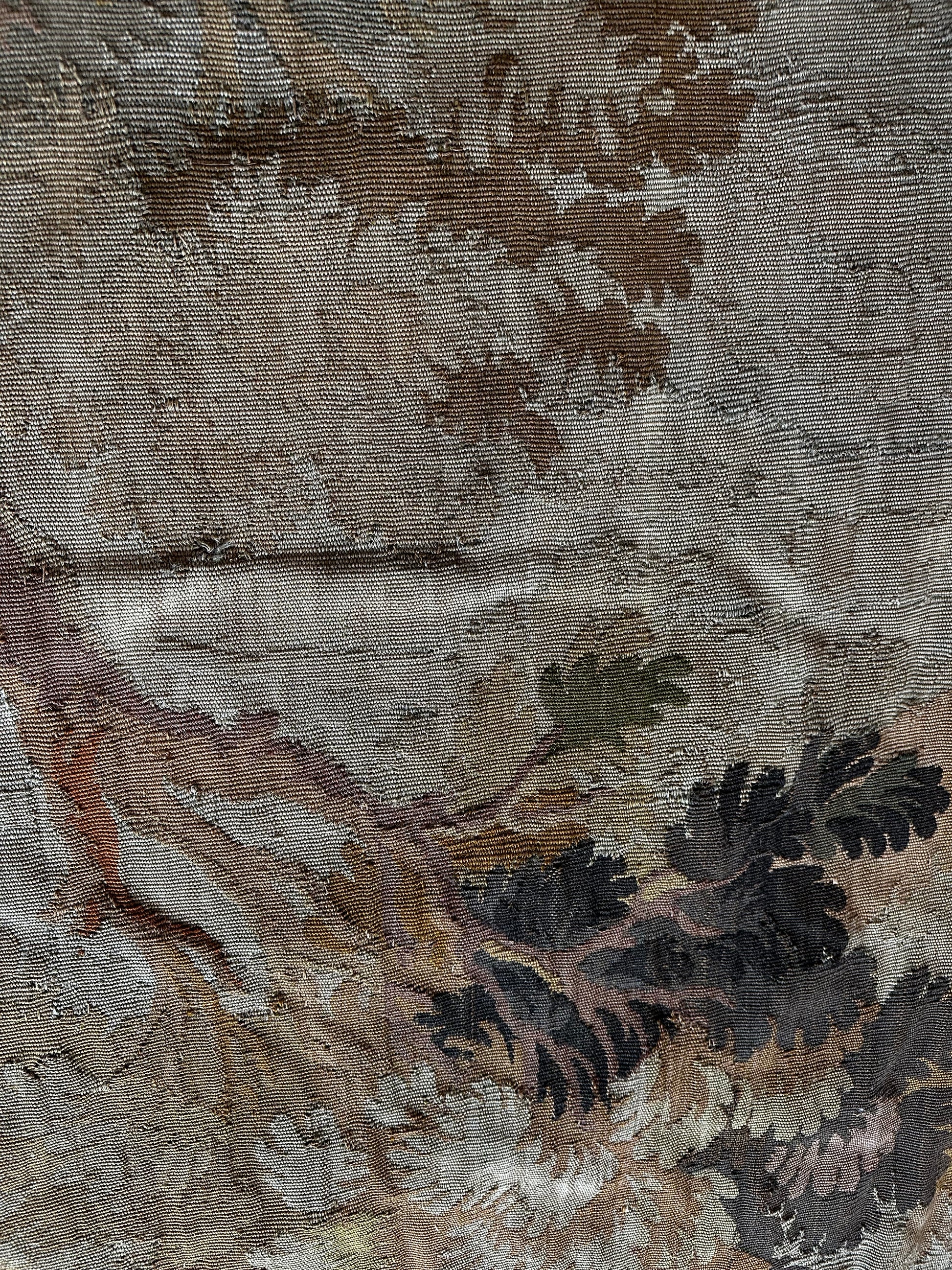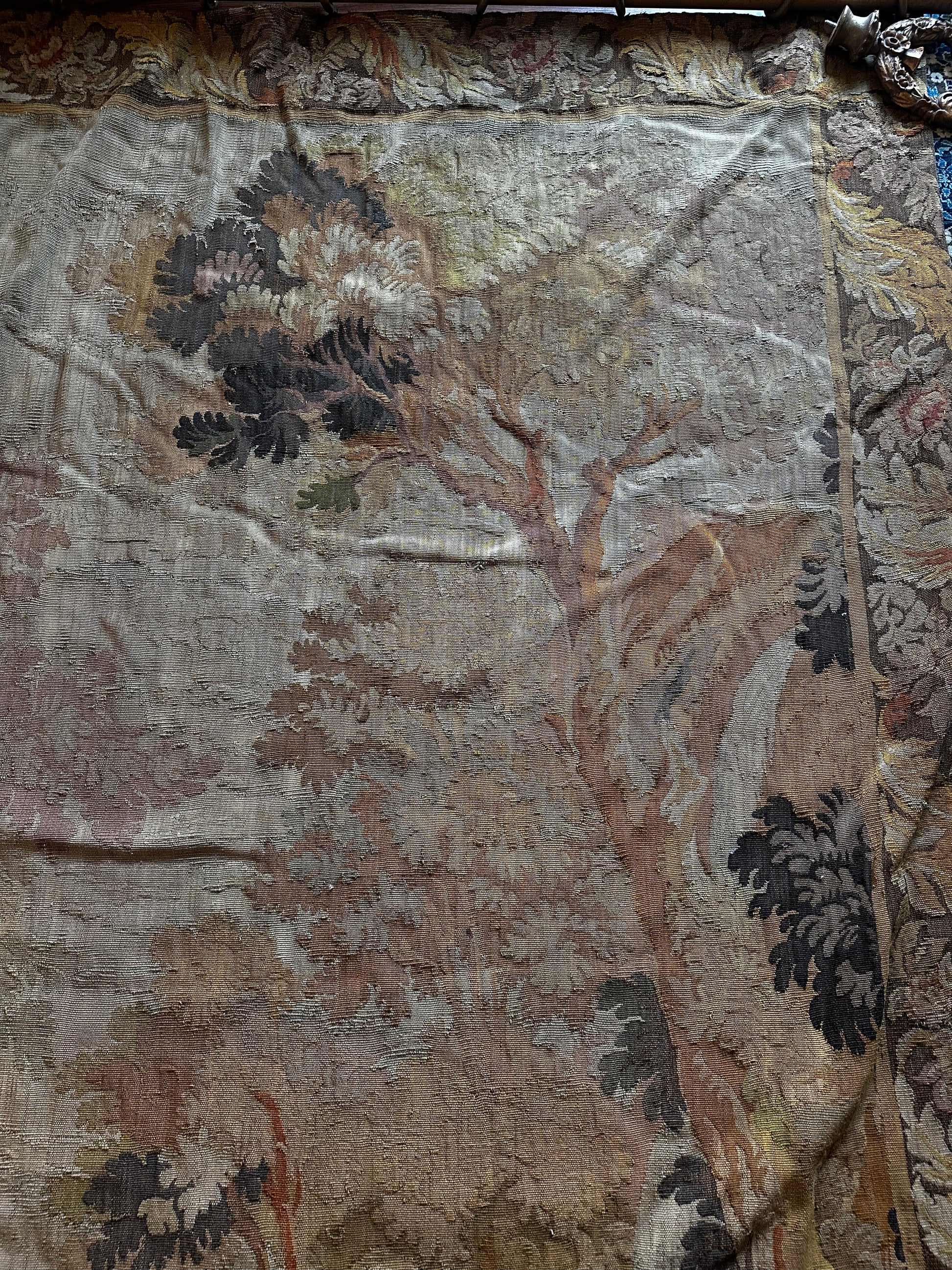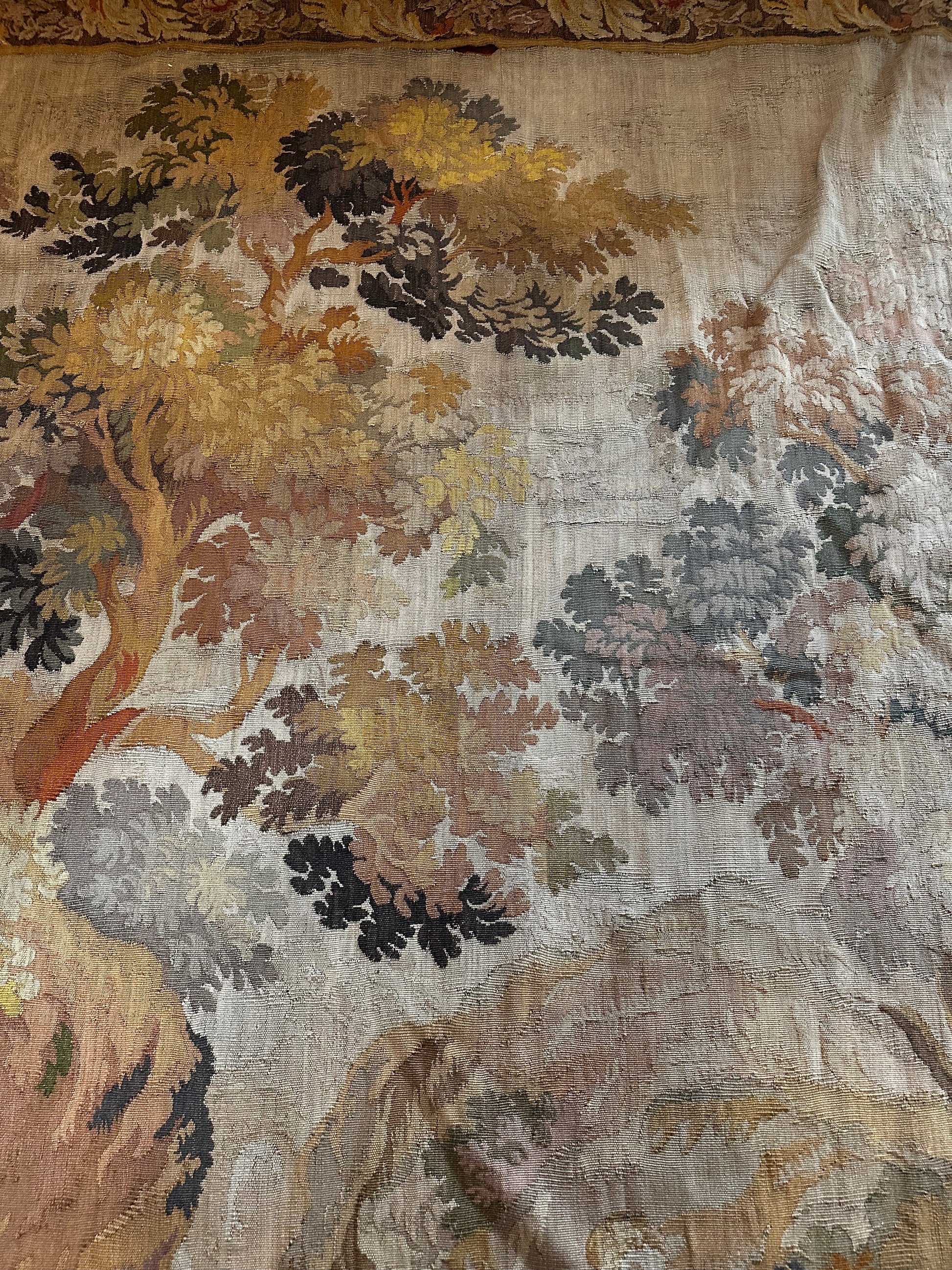 The tapestry has a conservation lining on the back and there are several places where holes are present due to the age of the tapestry, as depicted in photos.