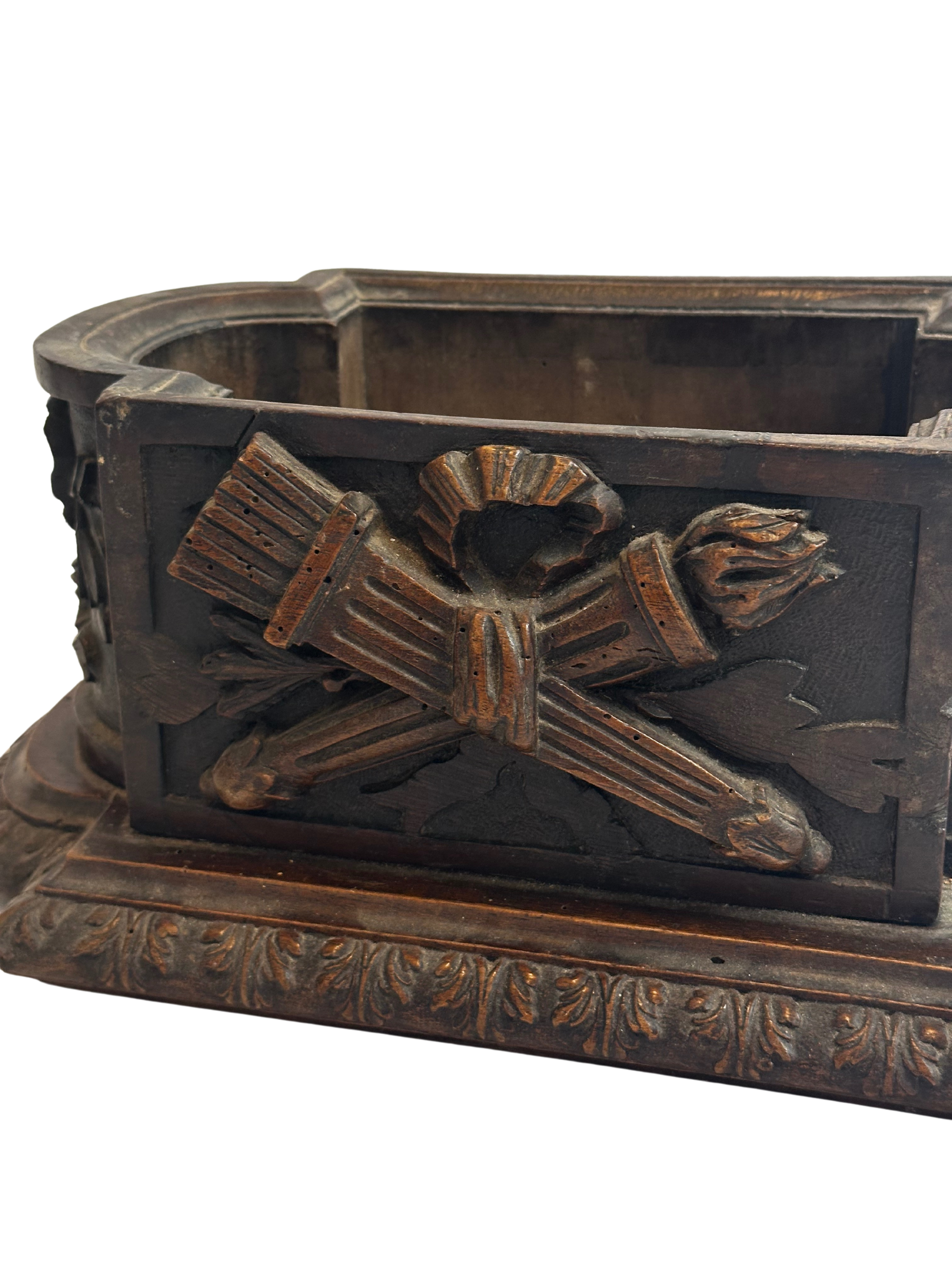 An exquisite hand-carved French walnut jardiniere crafted in the sought-after Black Forest style, featuring deeply sculpted Neoclassical "trophy" motifs of musical instruments, torches, and ribbon swags. The richly aged walnut surface highlights the fine three-dimensional carving, while the shaped rim and acanthus leaf base add a classical elegance. A sophisticated piece perfect for floral displays, a library accent, or refined decorative use.