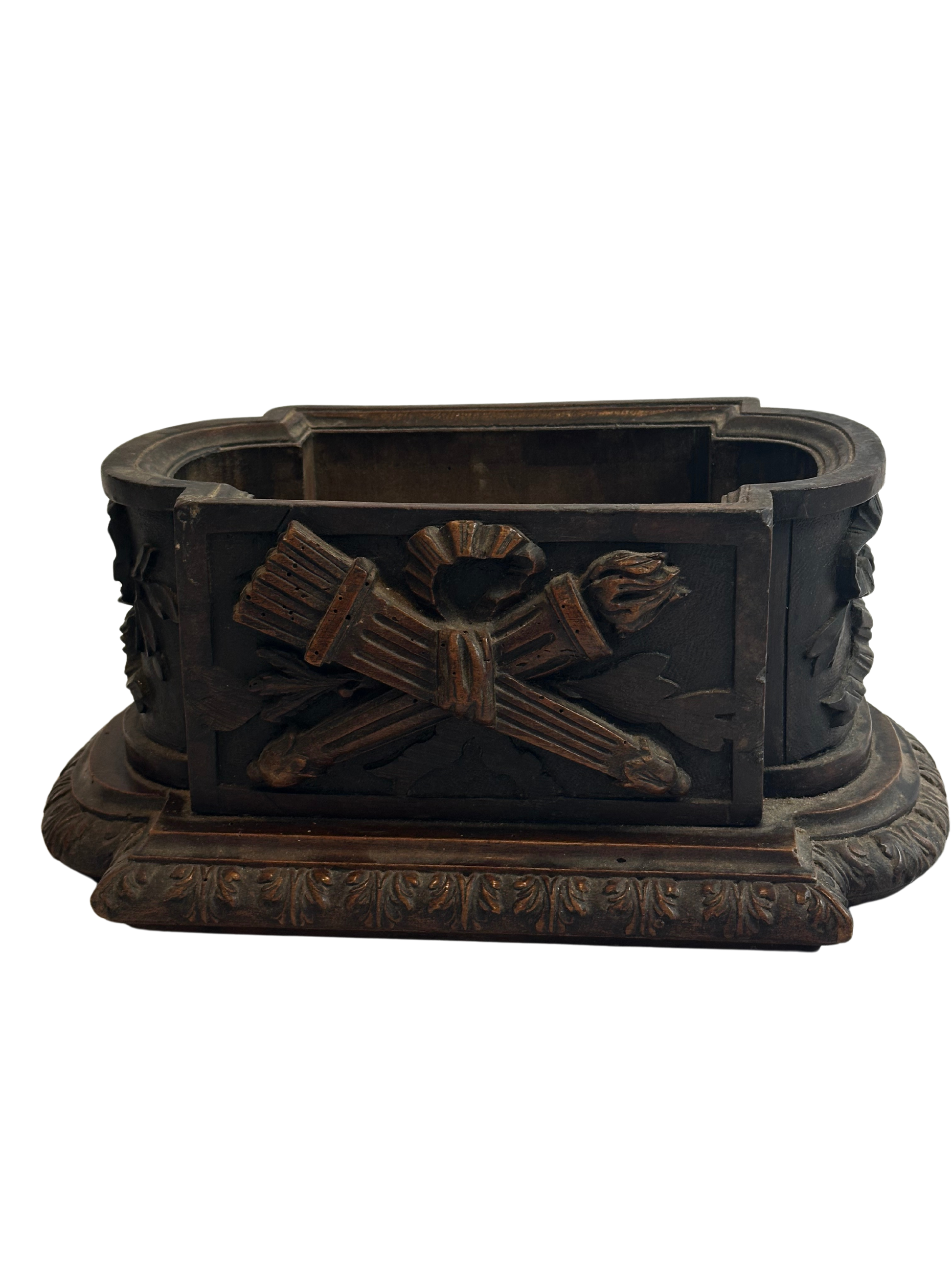 This finely carved walnut jardiniere captures that unique fusion, blending Black Forest's deep dimensional handwork with the refined symbolism beloved in French interiors. Elegant and sculptural, it would have graced a well-appointed salon or music room during the Belle Epoque era.