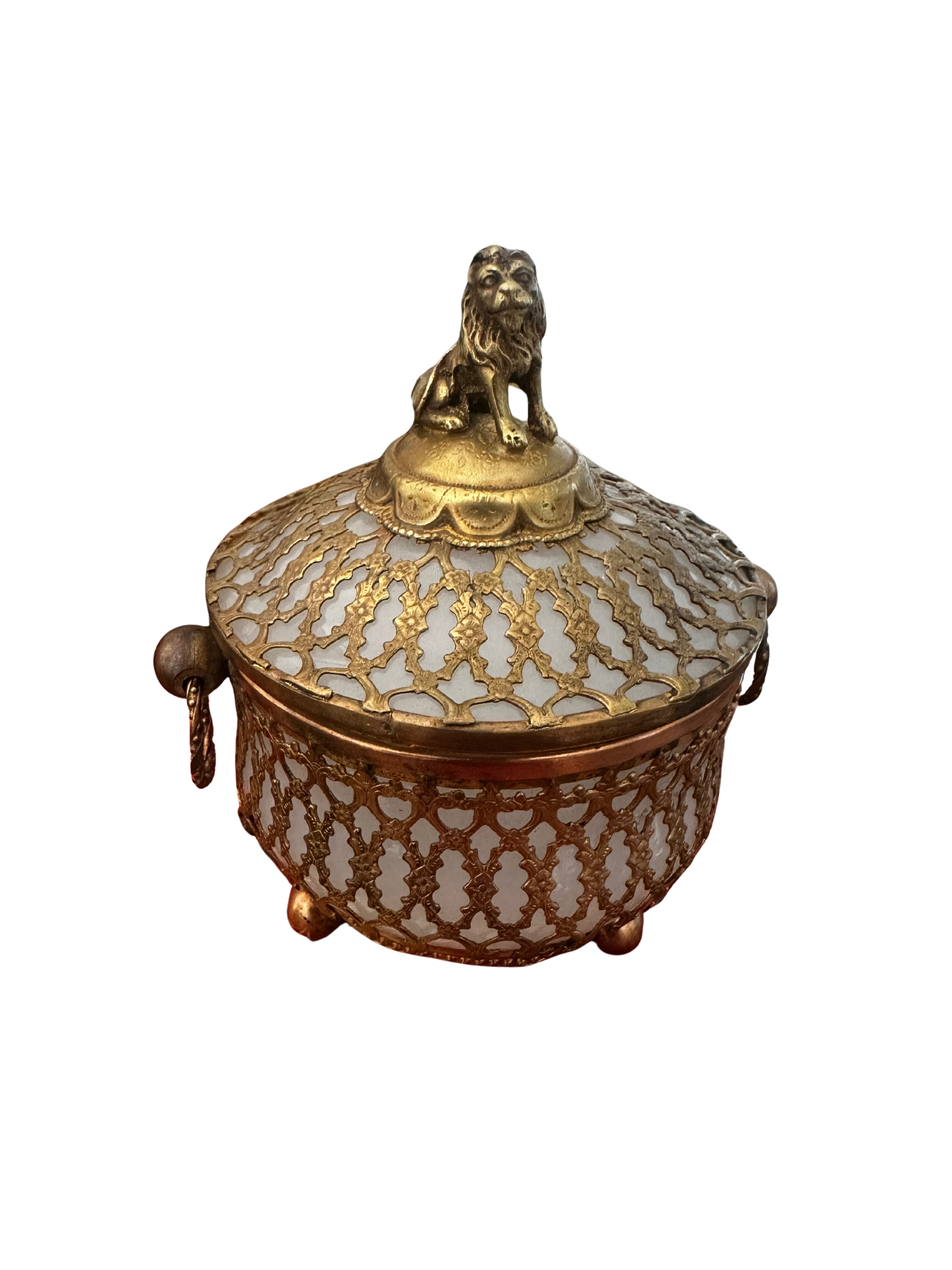 Mini Bronze Caged White Opaline Lidded Dish with Lion Finial