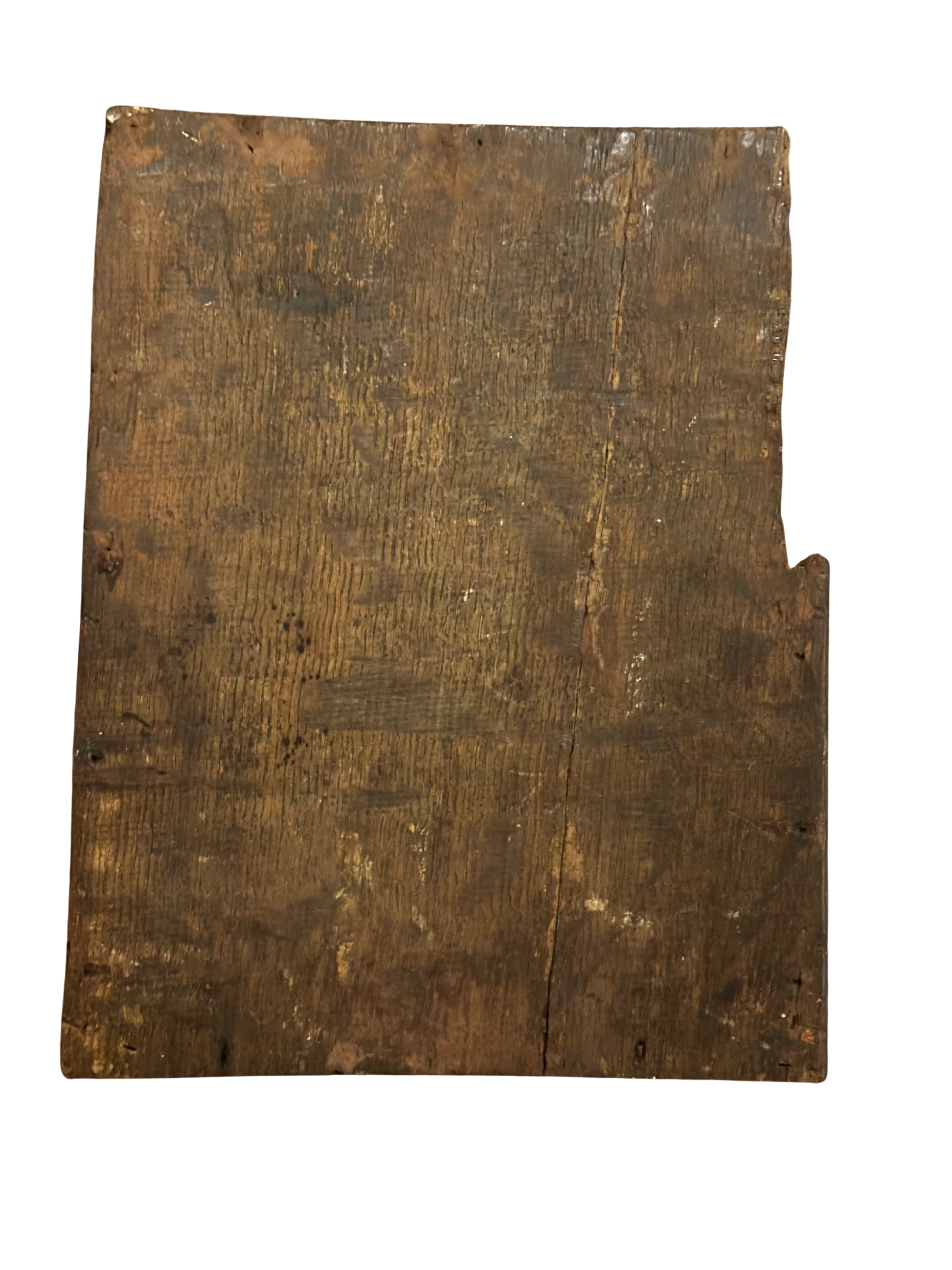 Two spots of paint loss. Inconsistent, natural edging to the wood panel. Split to the wood down the middle. Natural craquelure.