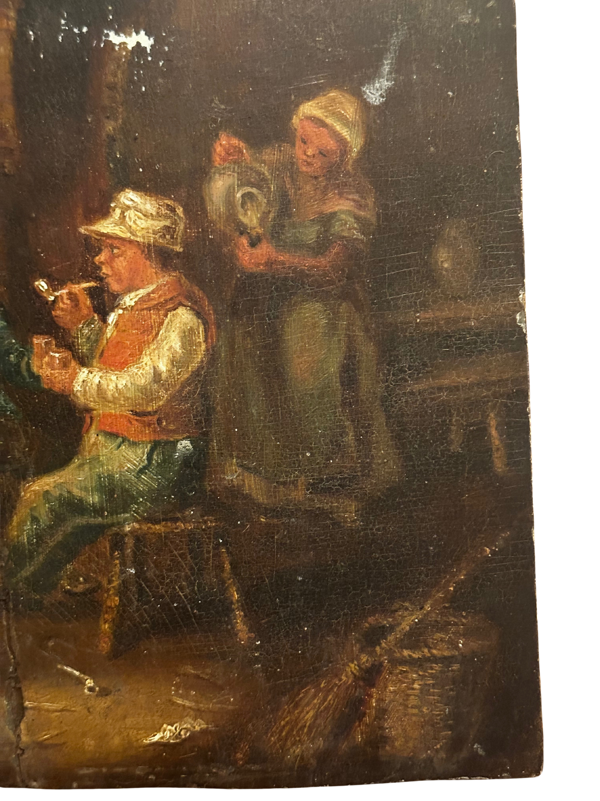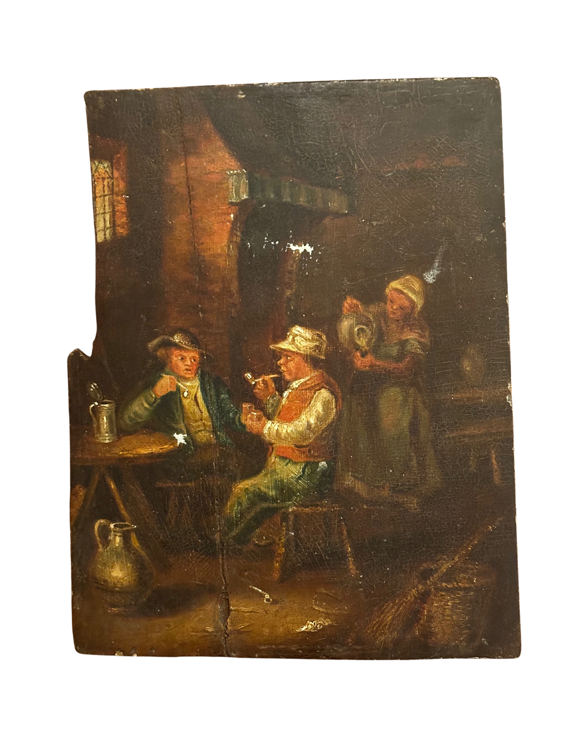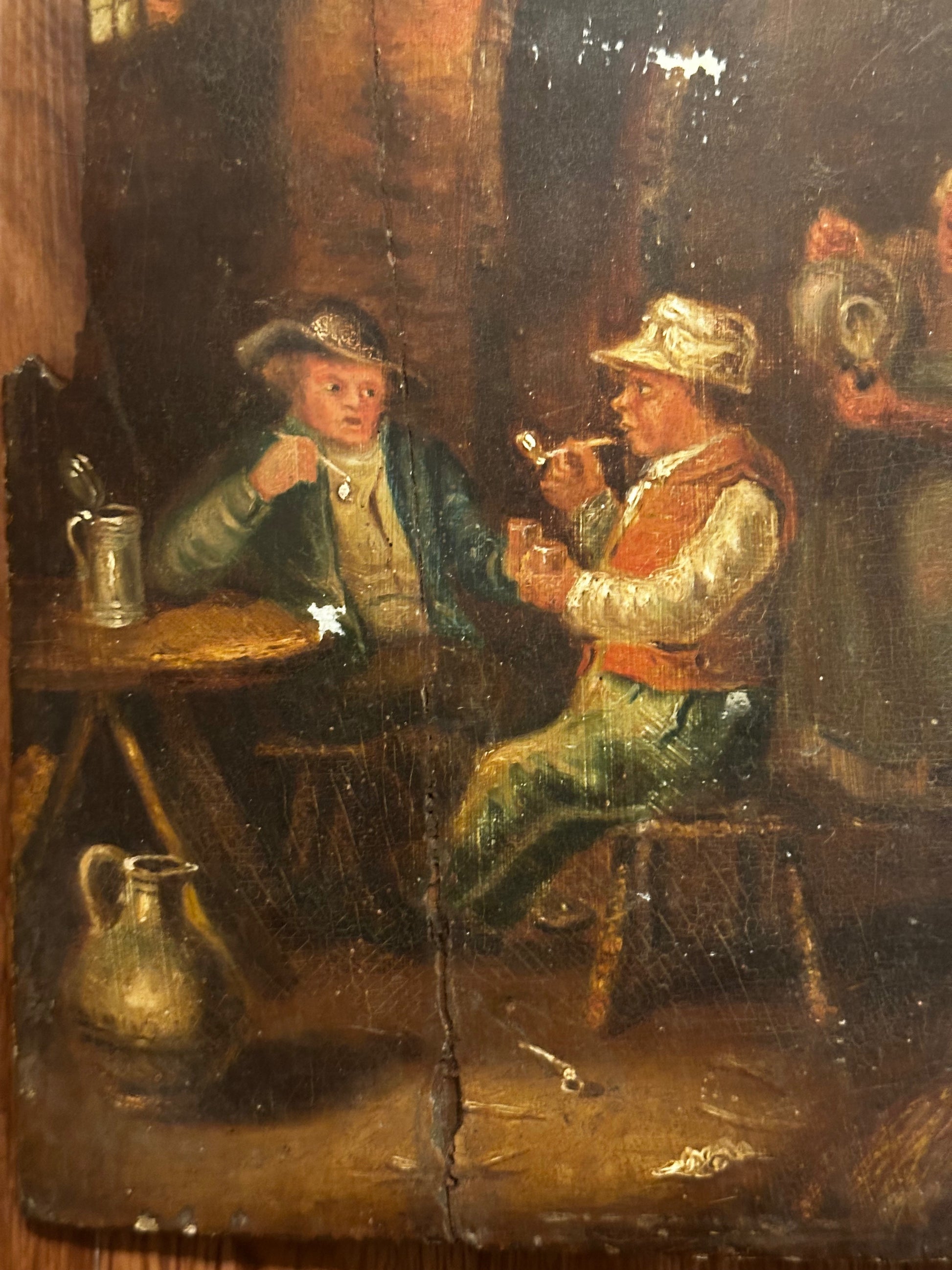 19th C Continental Oil on Wooden Panel of Two Men in a Tavern