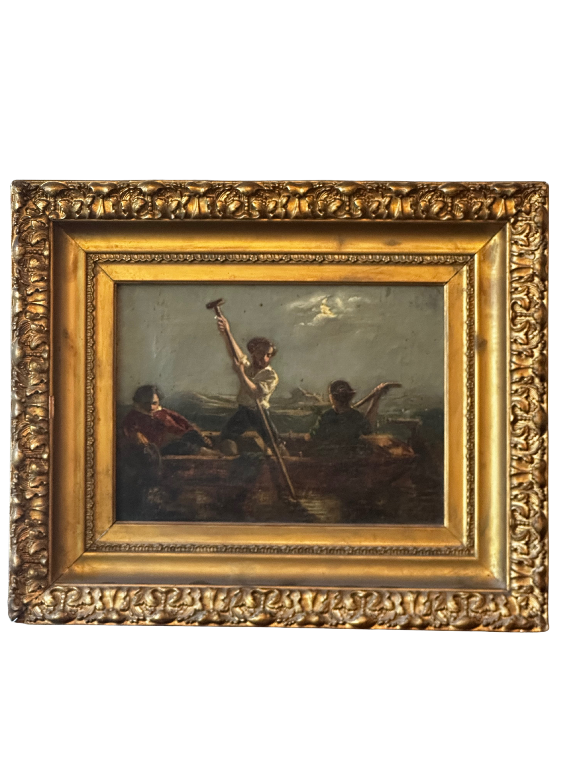 19th C Oil on Canvas of Two Men and a Woman in a Boat
