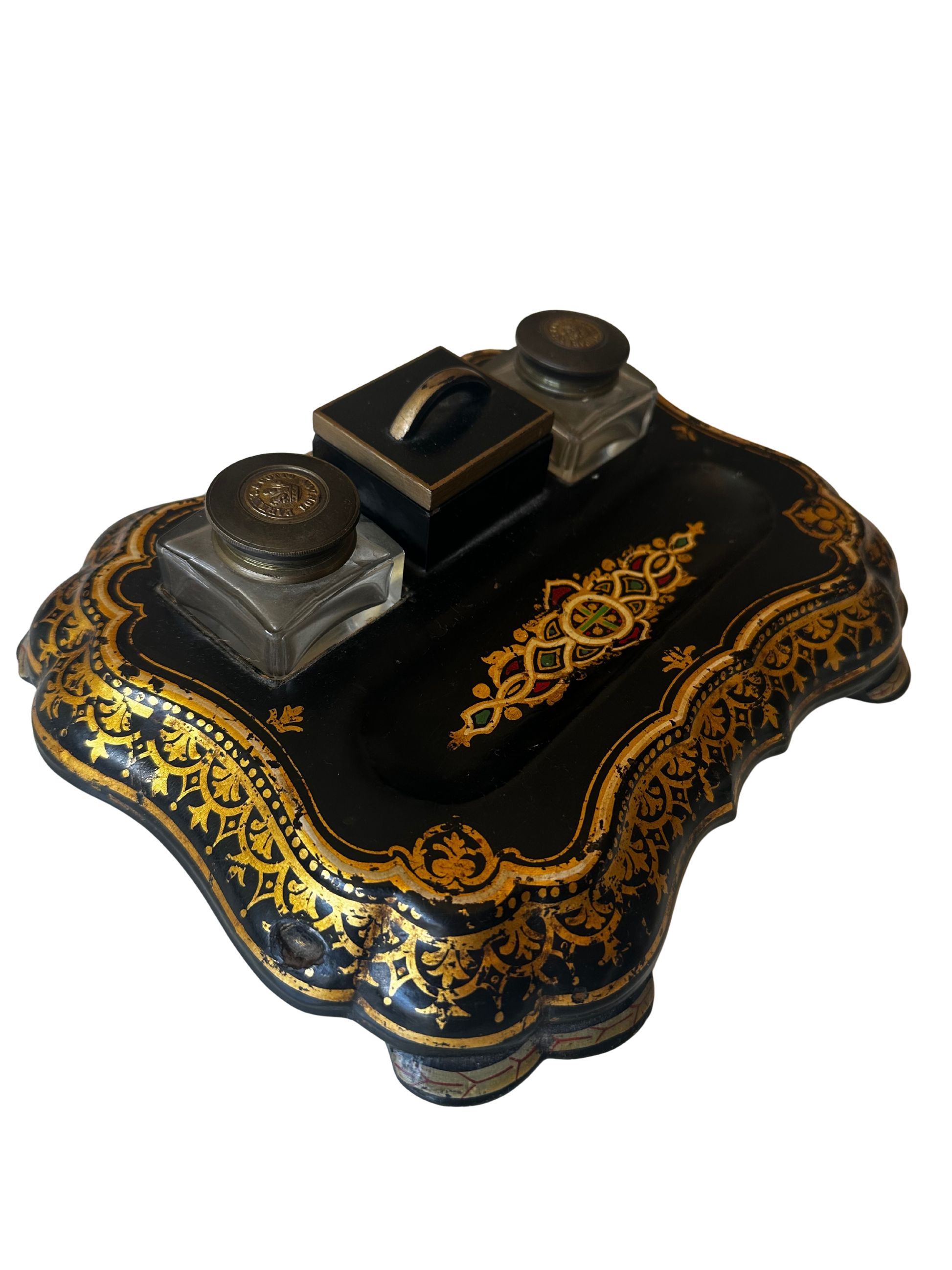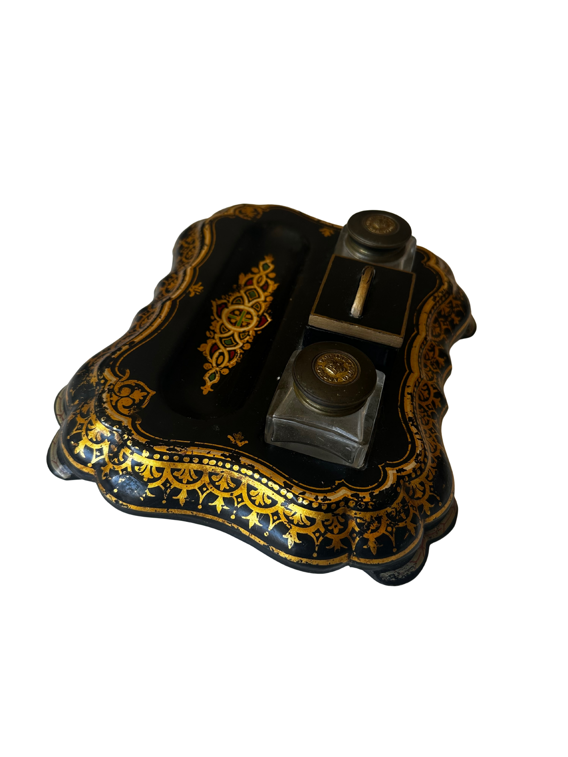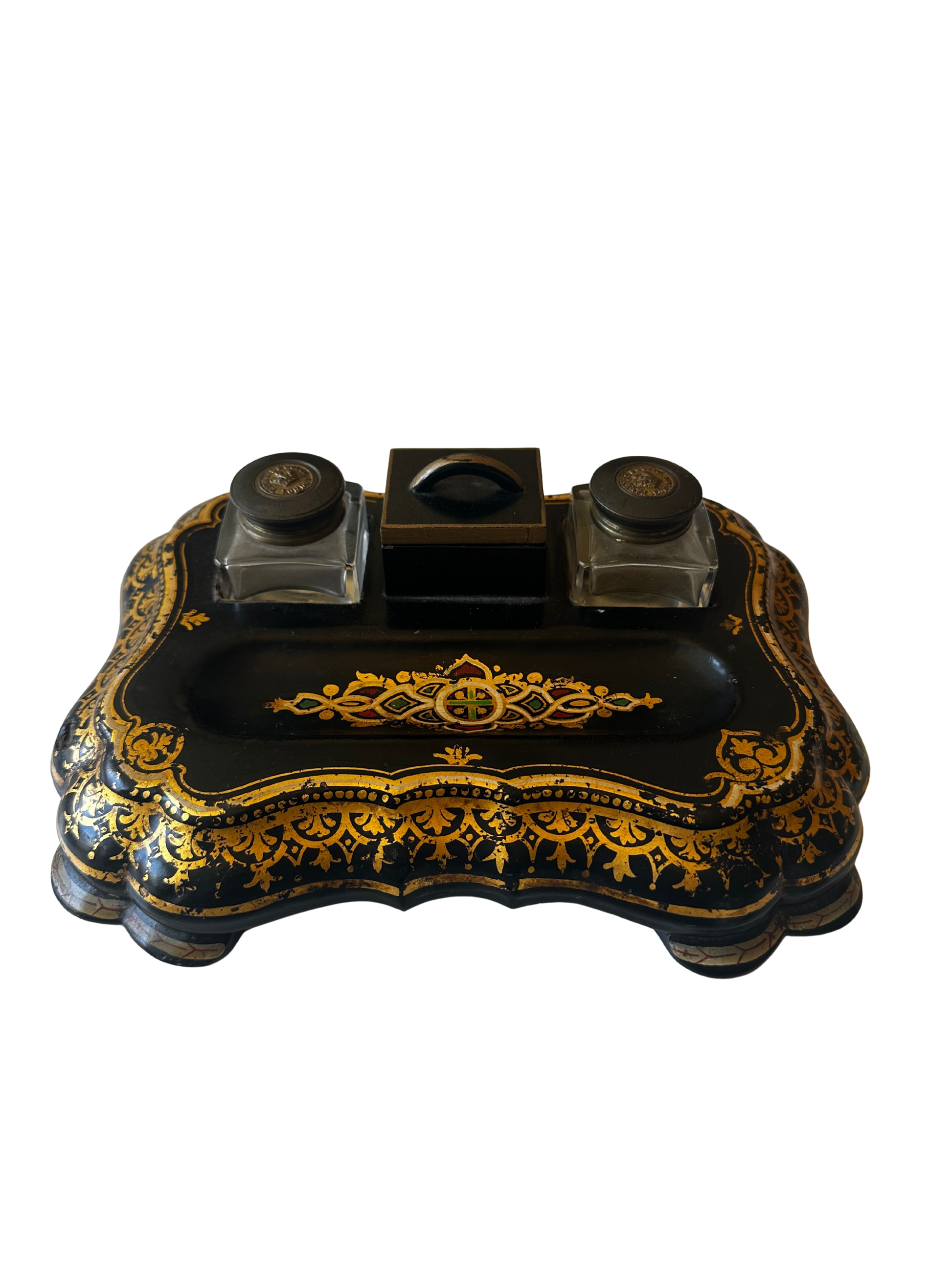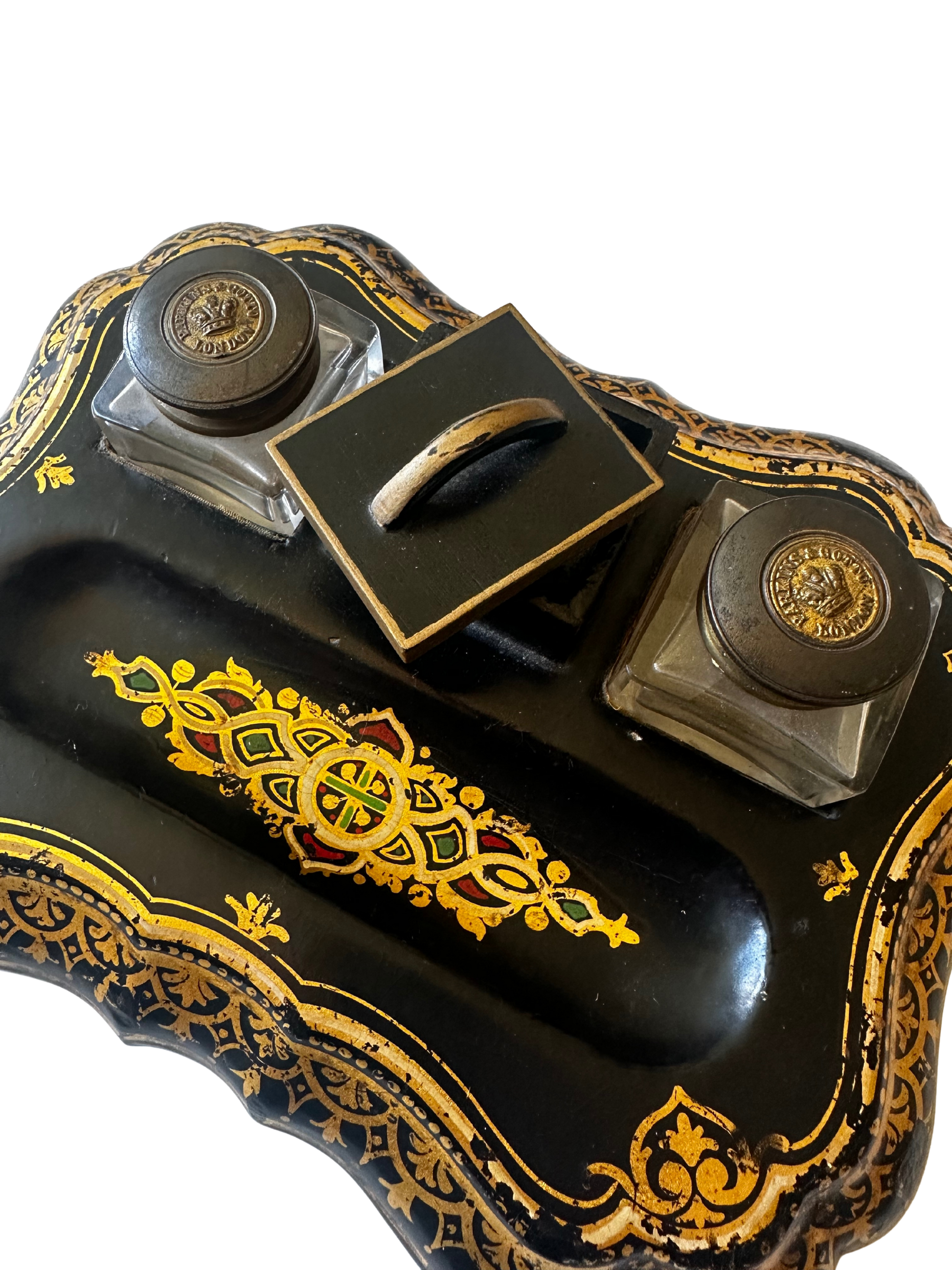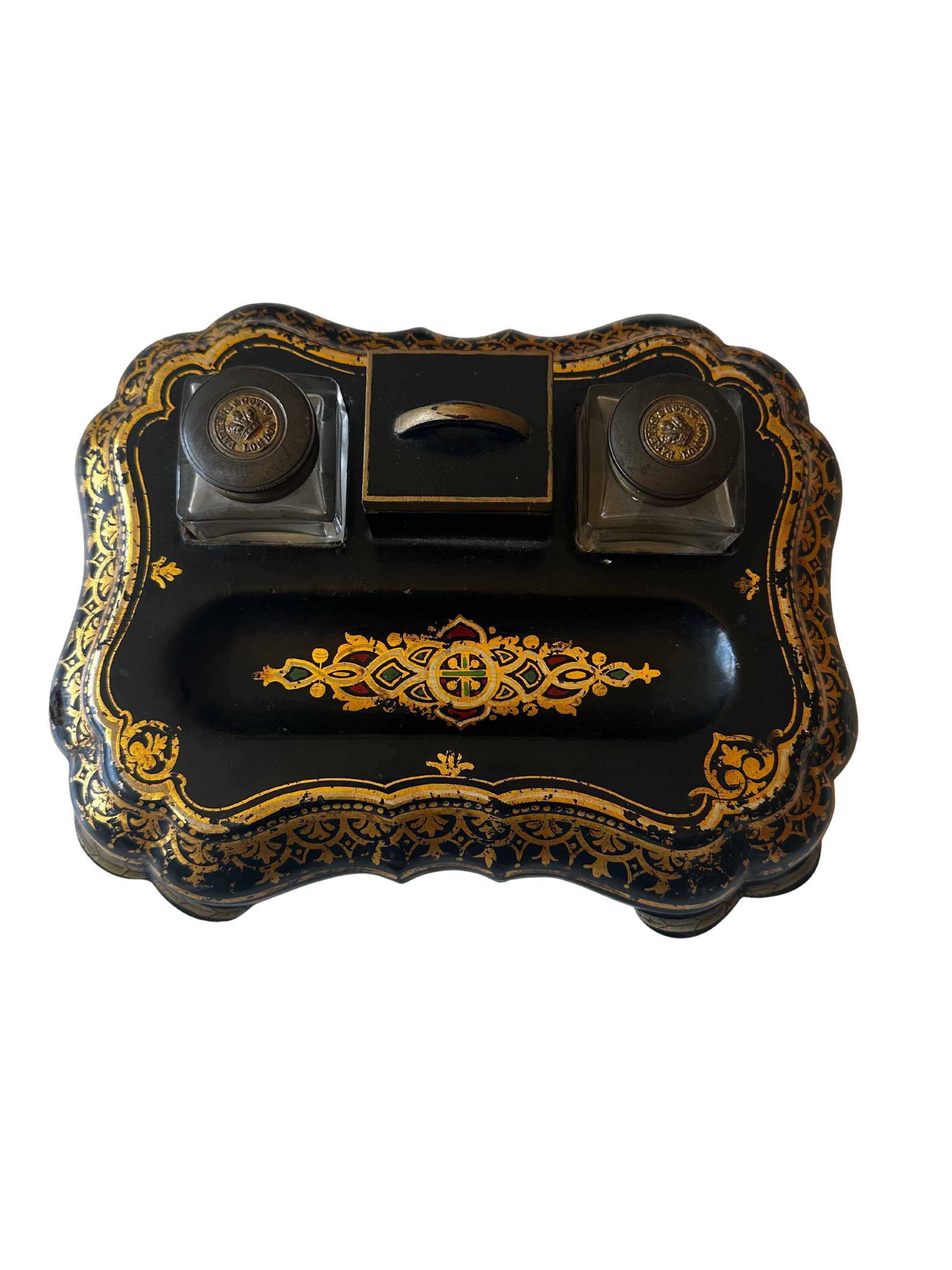 Black Lacquer Victorian Papier Mache Inkwell Set