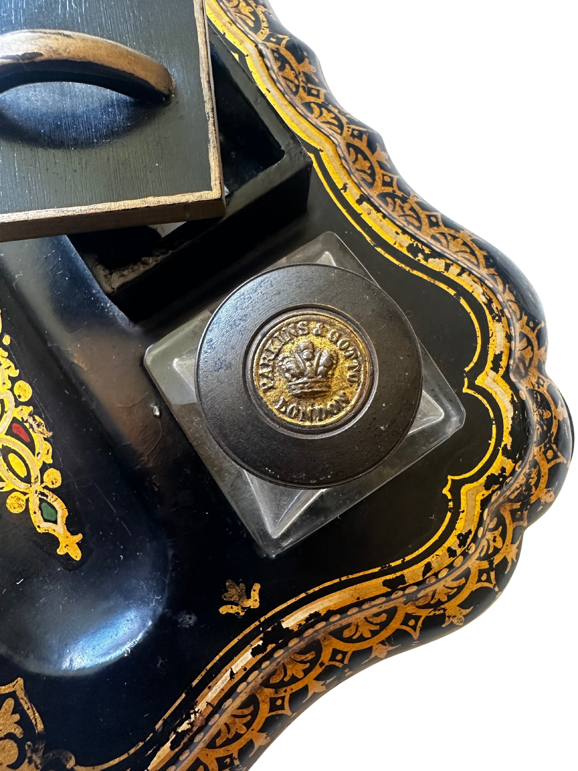 19th C Parkins & Gotto Black Lacquer Victorian Papier Mache Inkwell Set