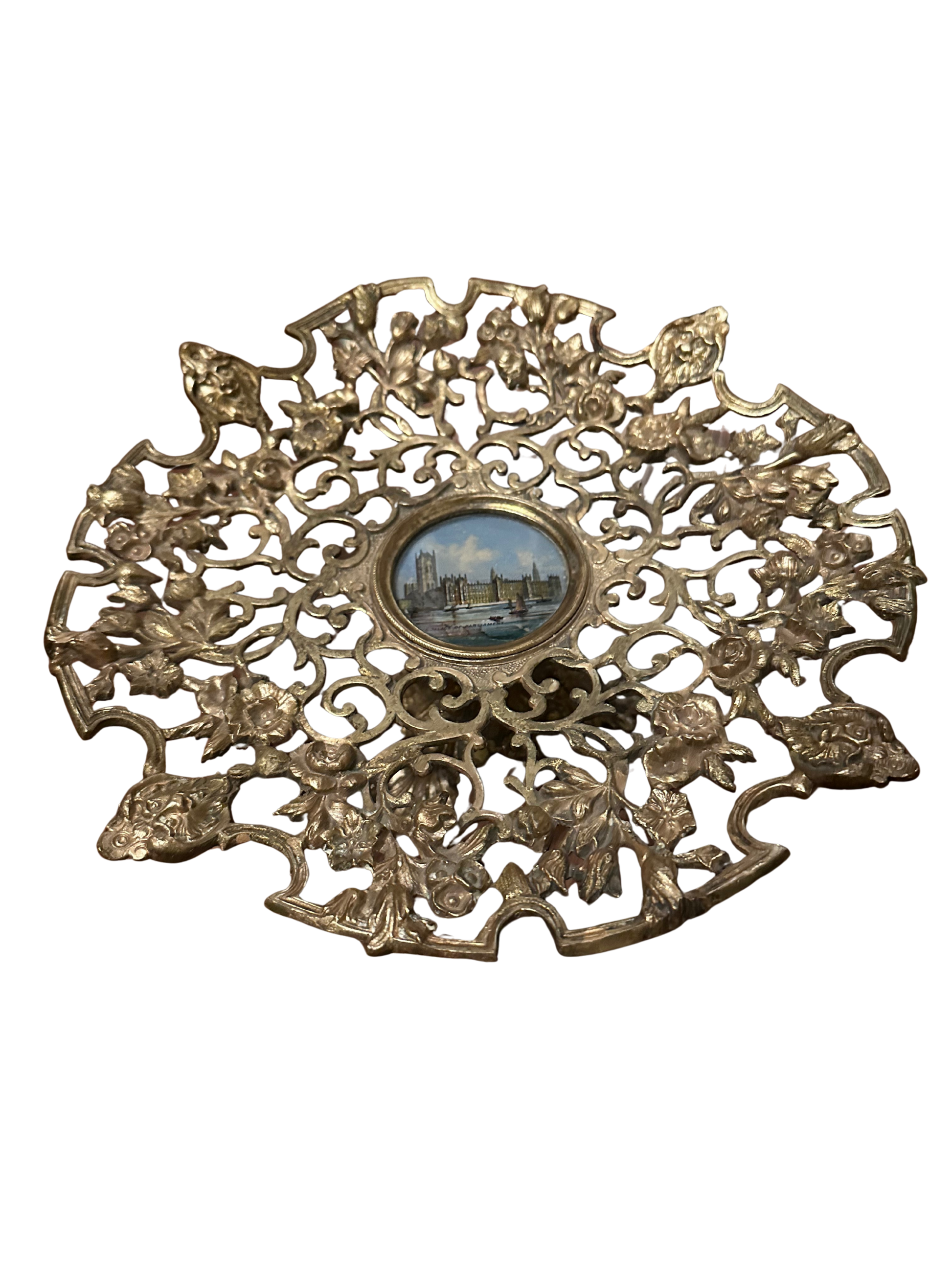 Grand Tour Gold Metal Tazza with Reverse Painted Scene in Center and Figural Faces