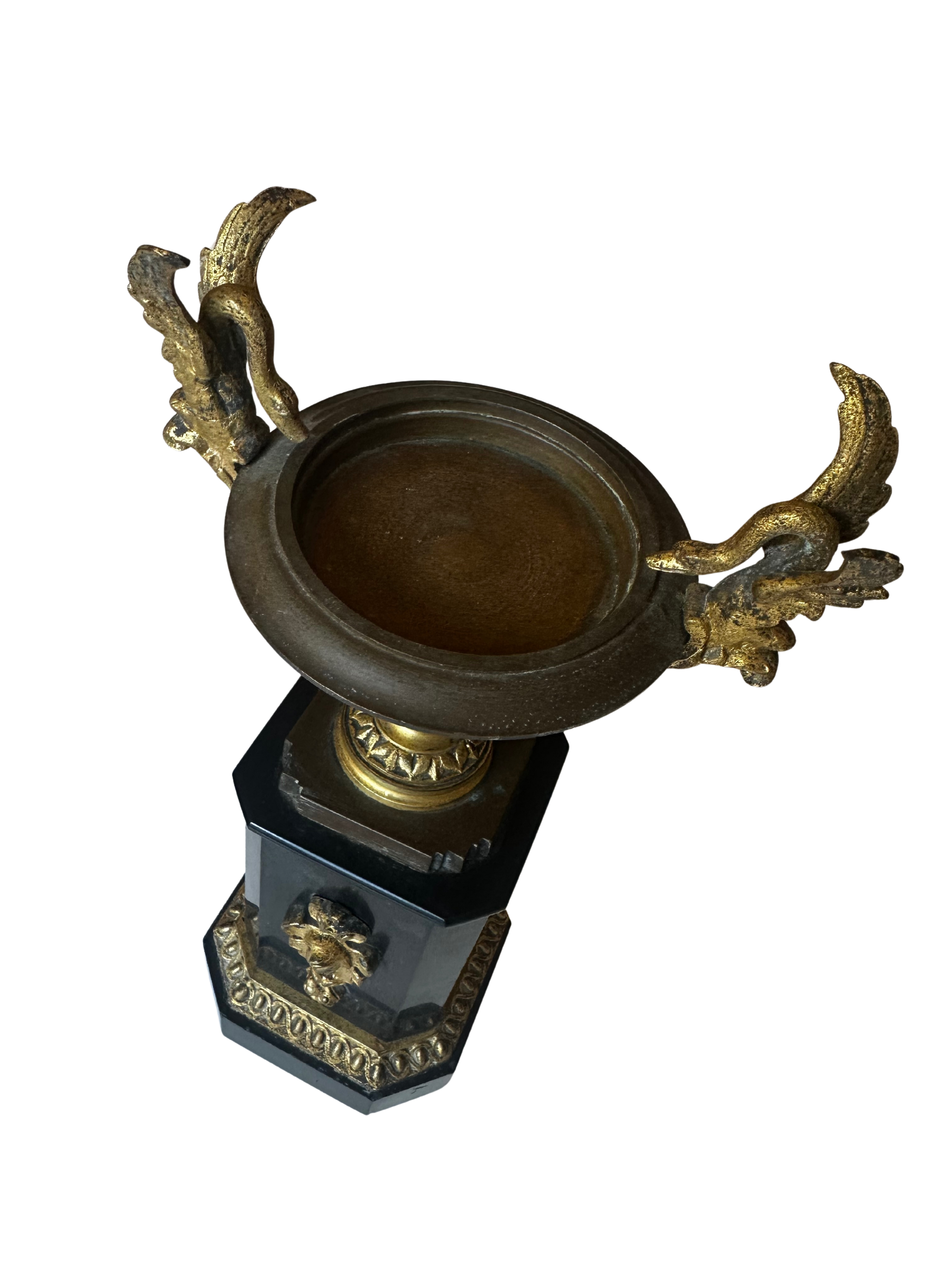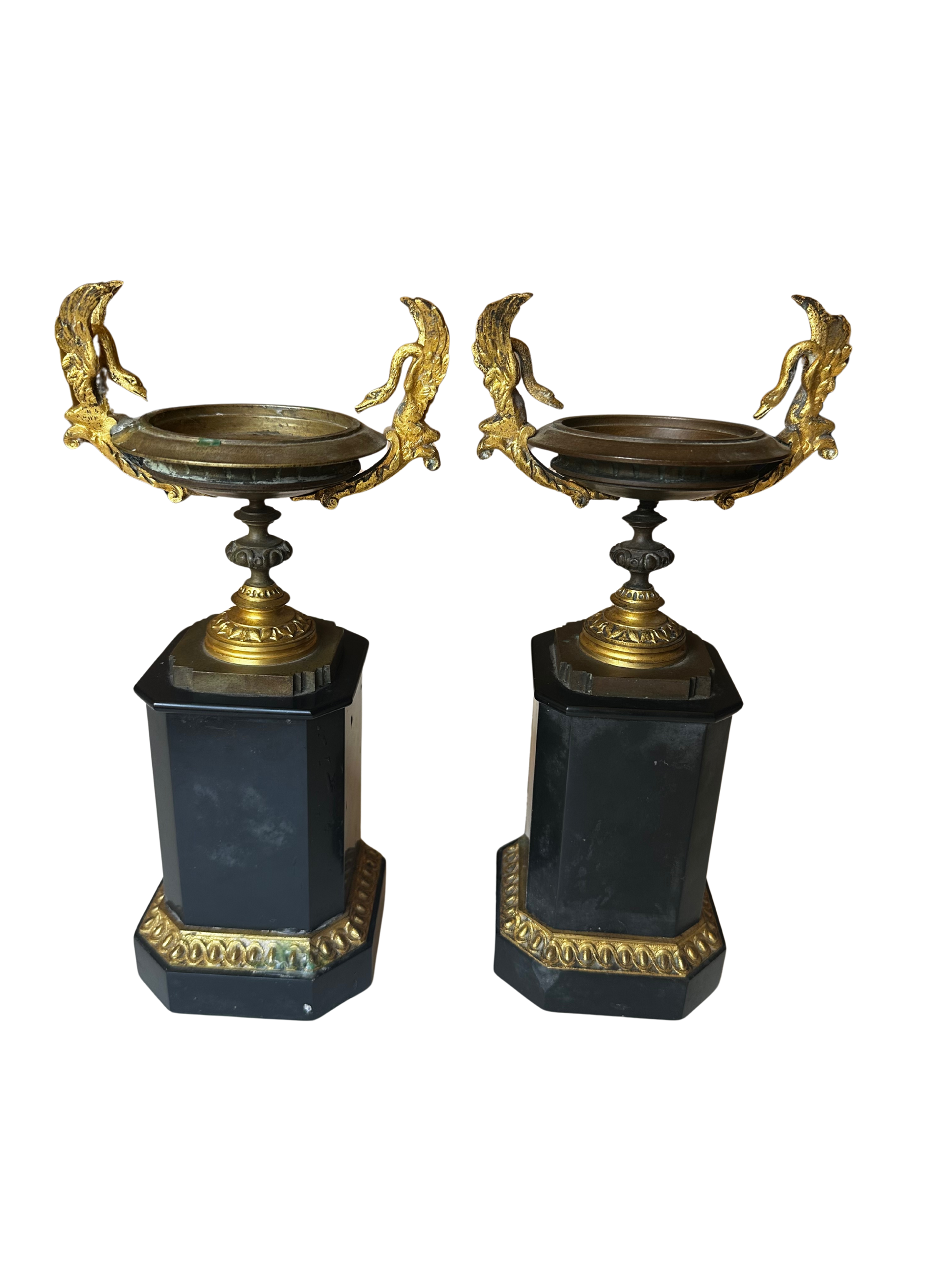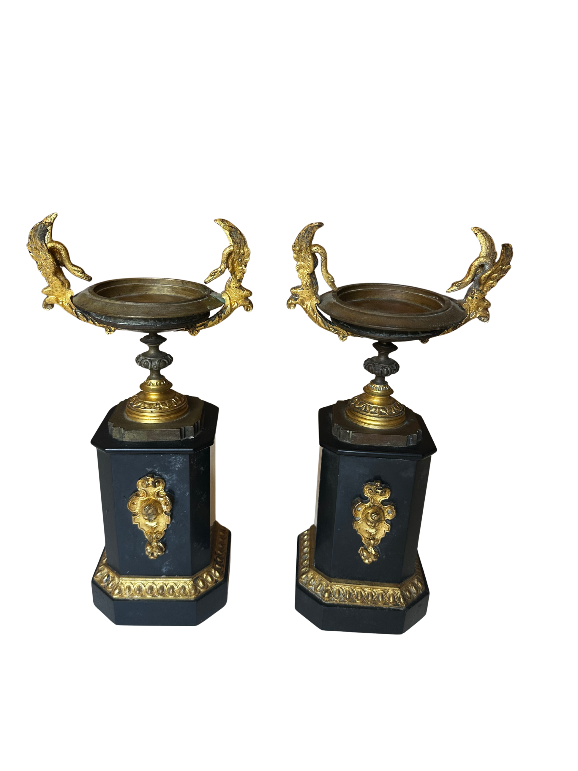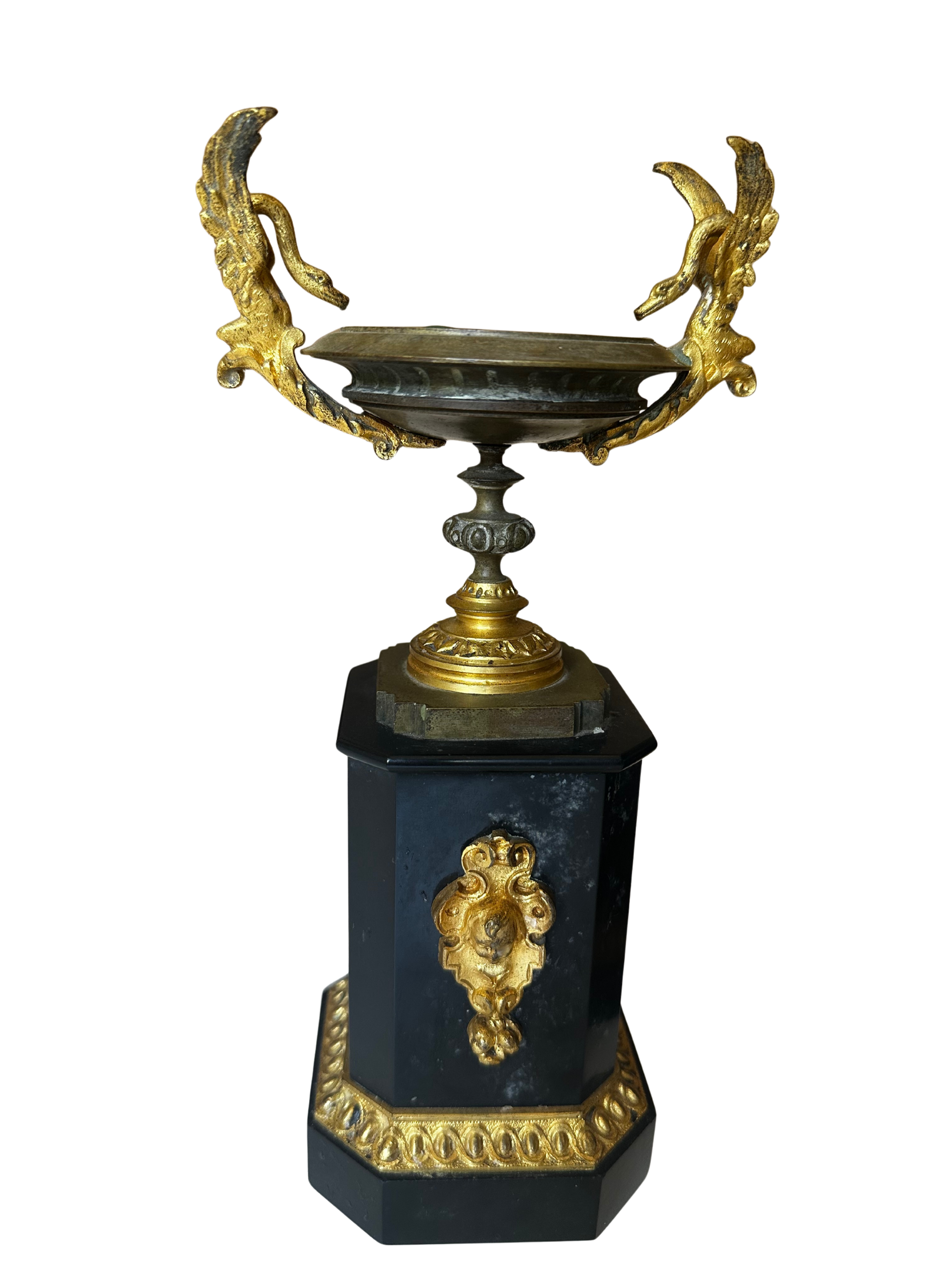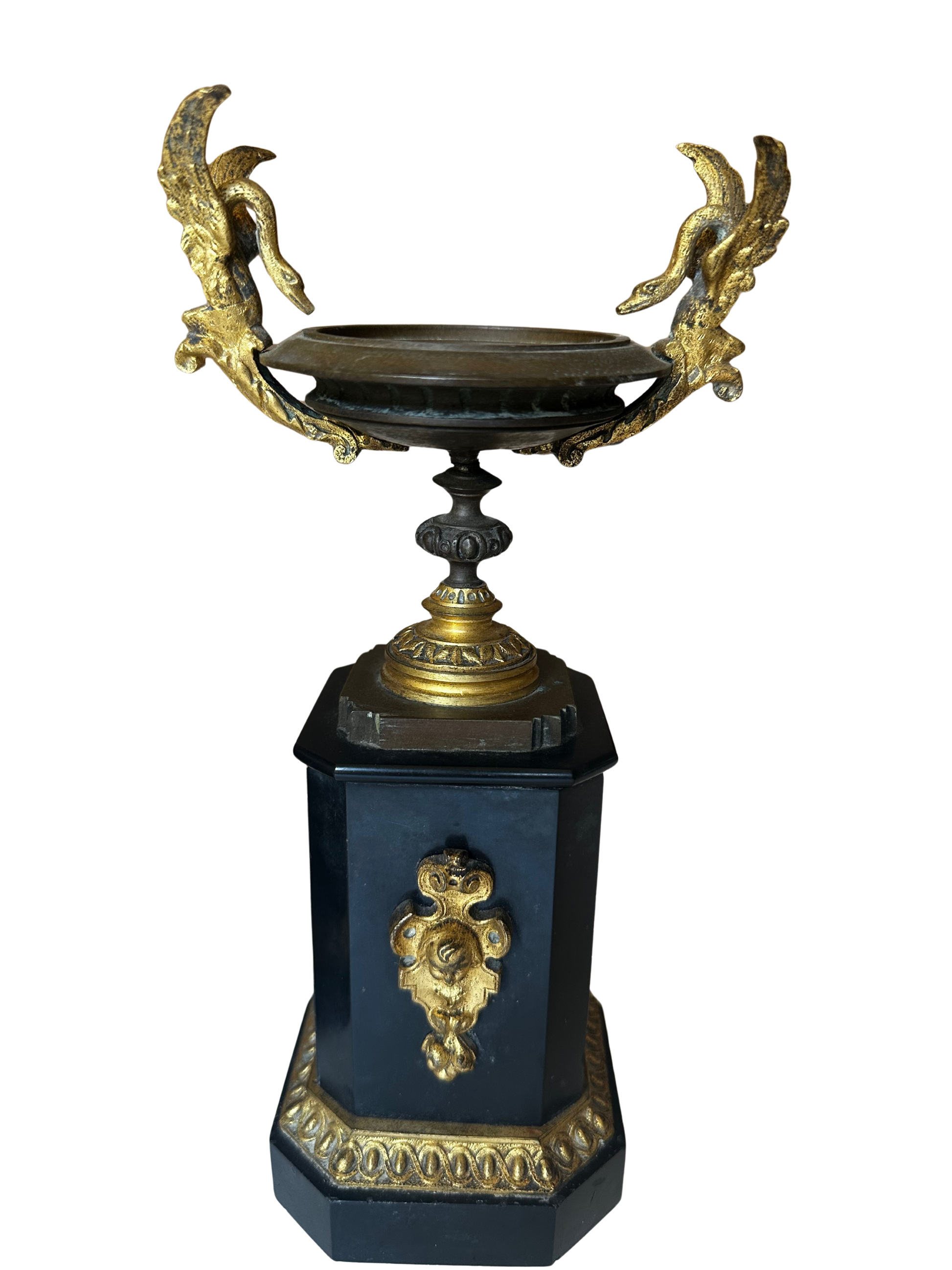 Gilt bronze appliques of swans with wings extended flanking the bowls and cherub mask appliques and egg-and-dart trim at the plinth.