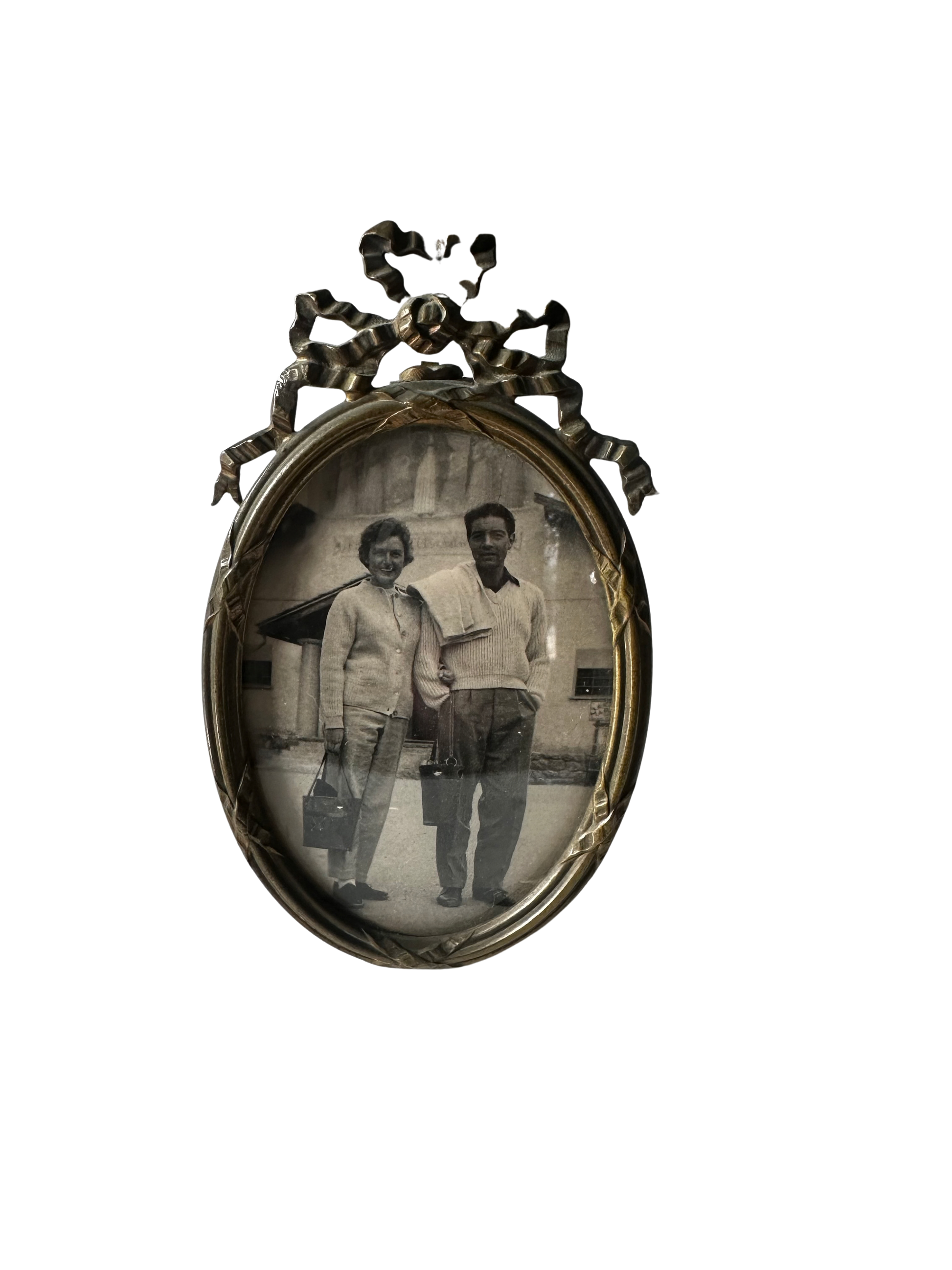 During the late 19th and early 20th centuries, Louis XVI revival motifs — including ribbon crests, bows, and laurel garlands — were widely embraced in both France and England. Gilt brass frames such as this were commonly displayed on vanities, mantelpieces, and bedside tables, often holding treasured studio portraits or travel photographs.