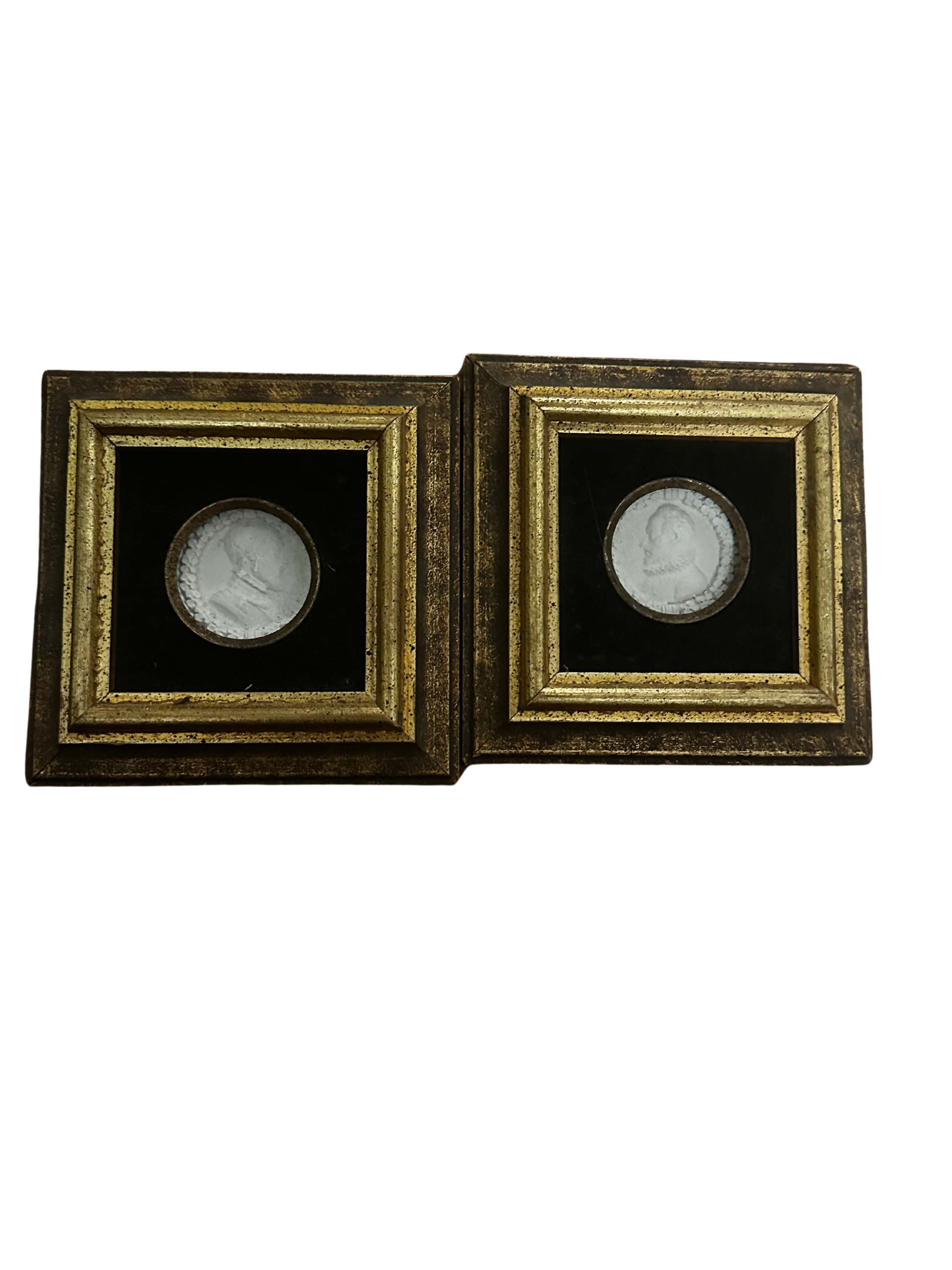 Two Renaissance style male profiles in sculptural relief, likely intended to depict notable historic or literary figures like Shakespeare, Dante or Medici nobles