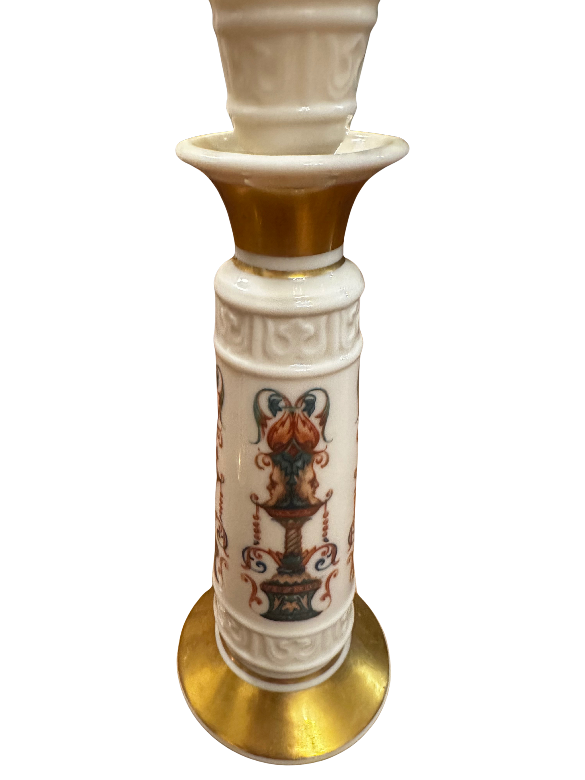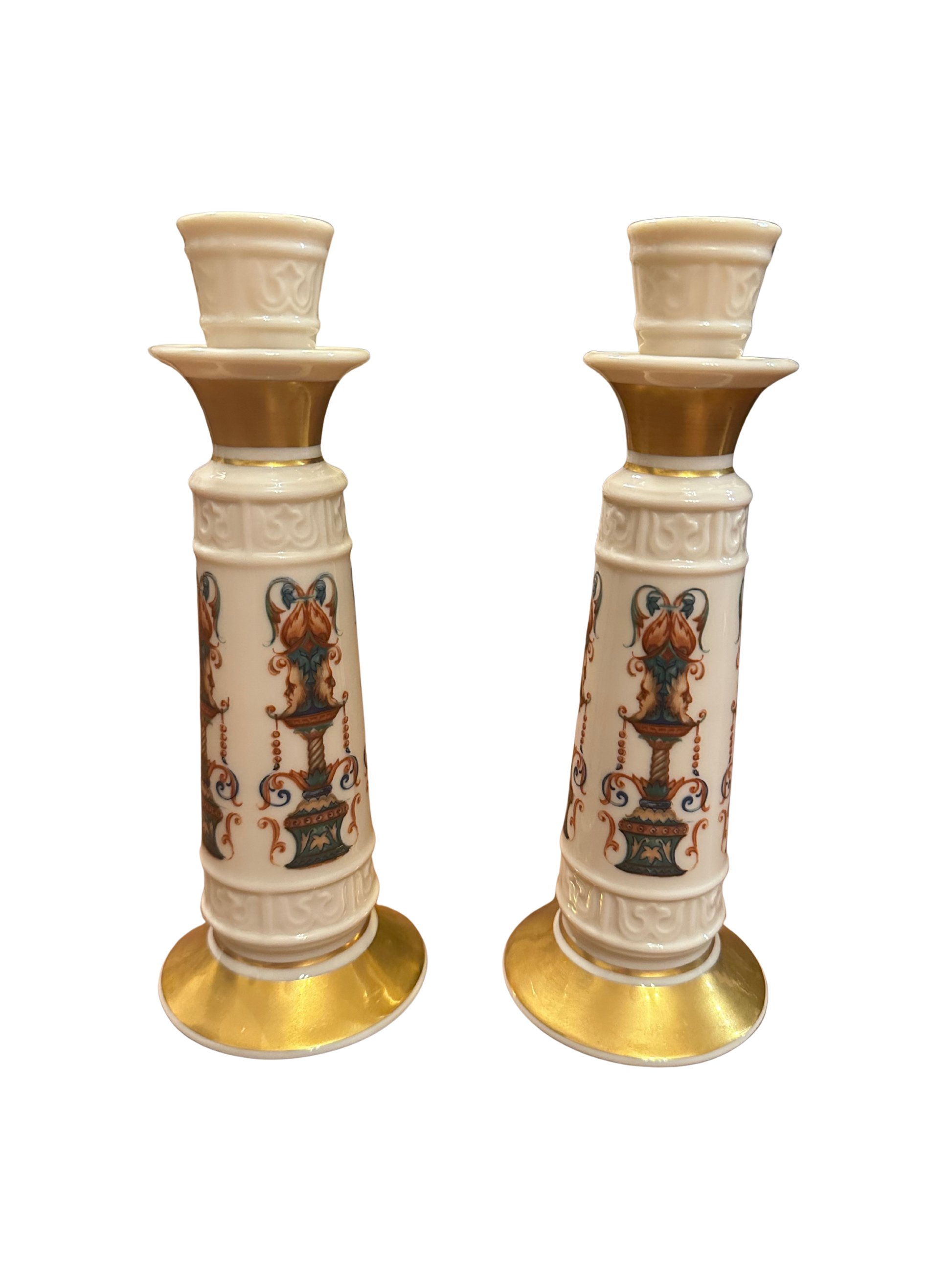 Pair of Lenox porcelain candlesticks with rich Imari-style decoration in iron red, teal, navy and gold.