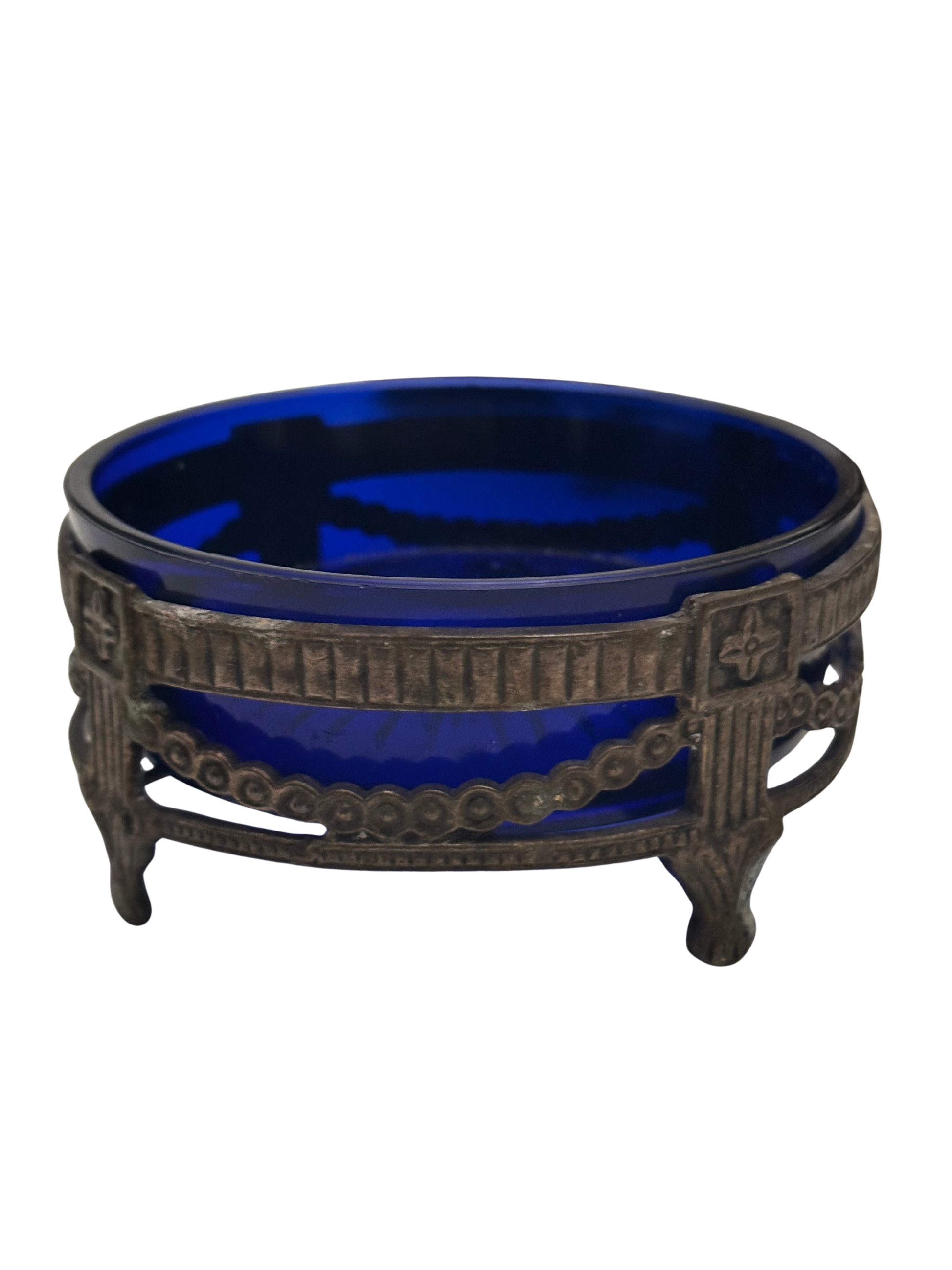 Silver Metal Caged Cobalt Blue Glass Bon Bon Dish (Patinated)