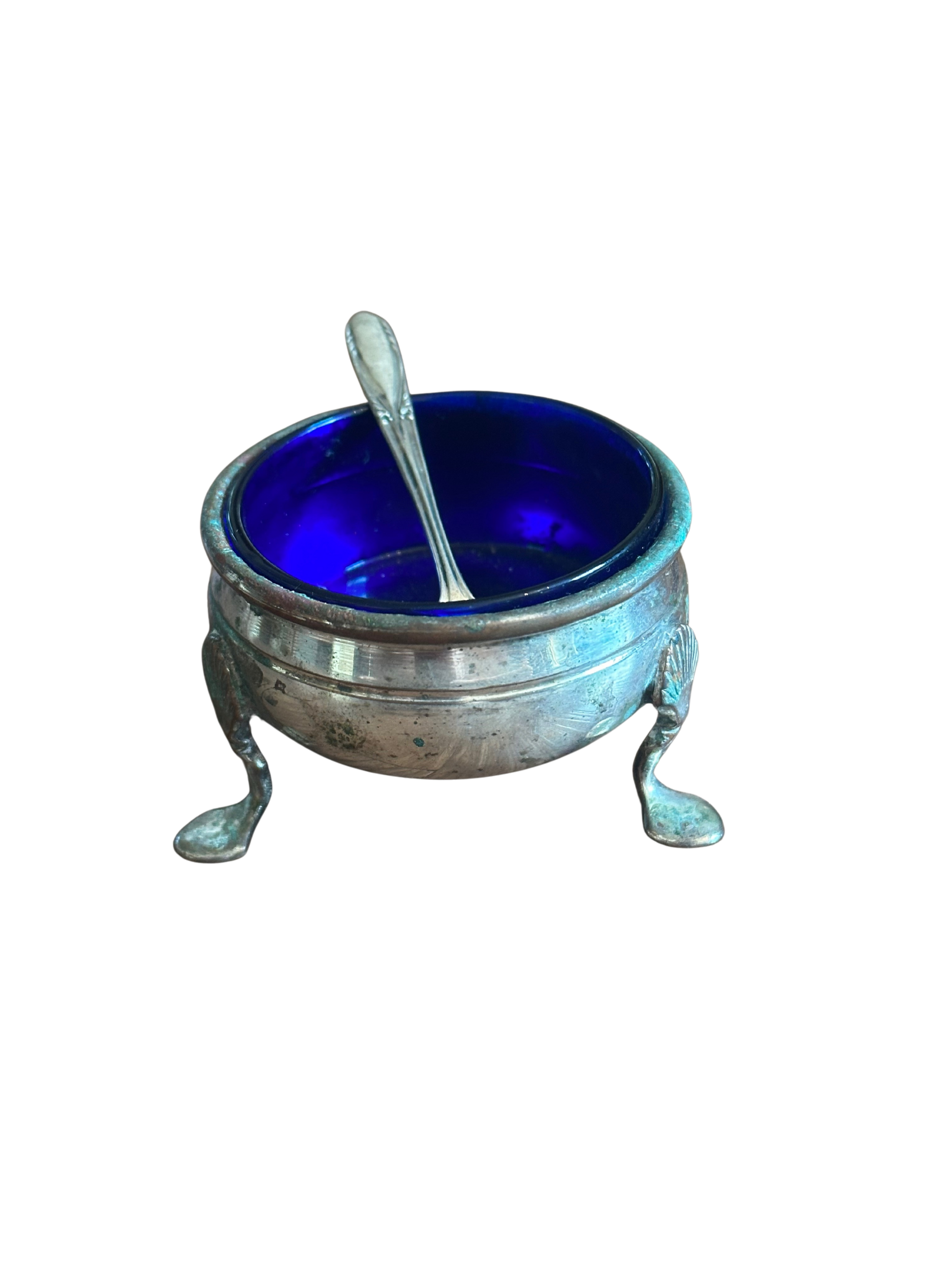 Silver Salt Cellar with Shell Legs (Tarnish) with Cobalt Blue Insert and Sterling Silver Spoon