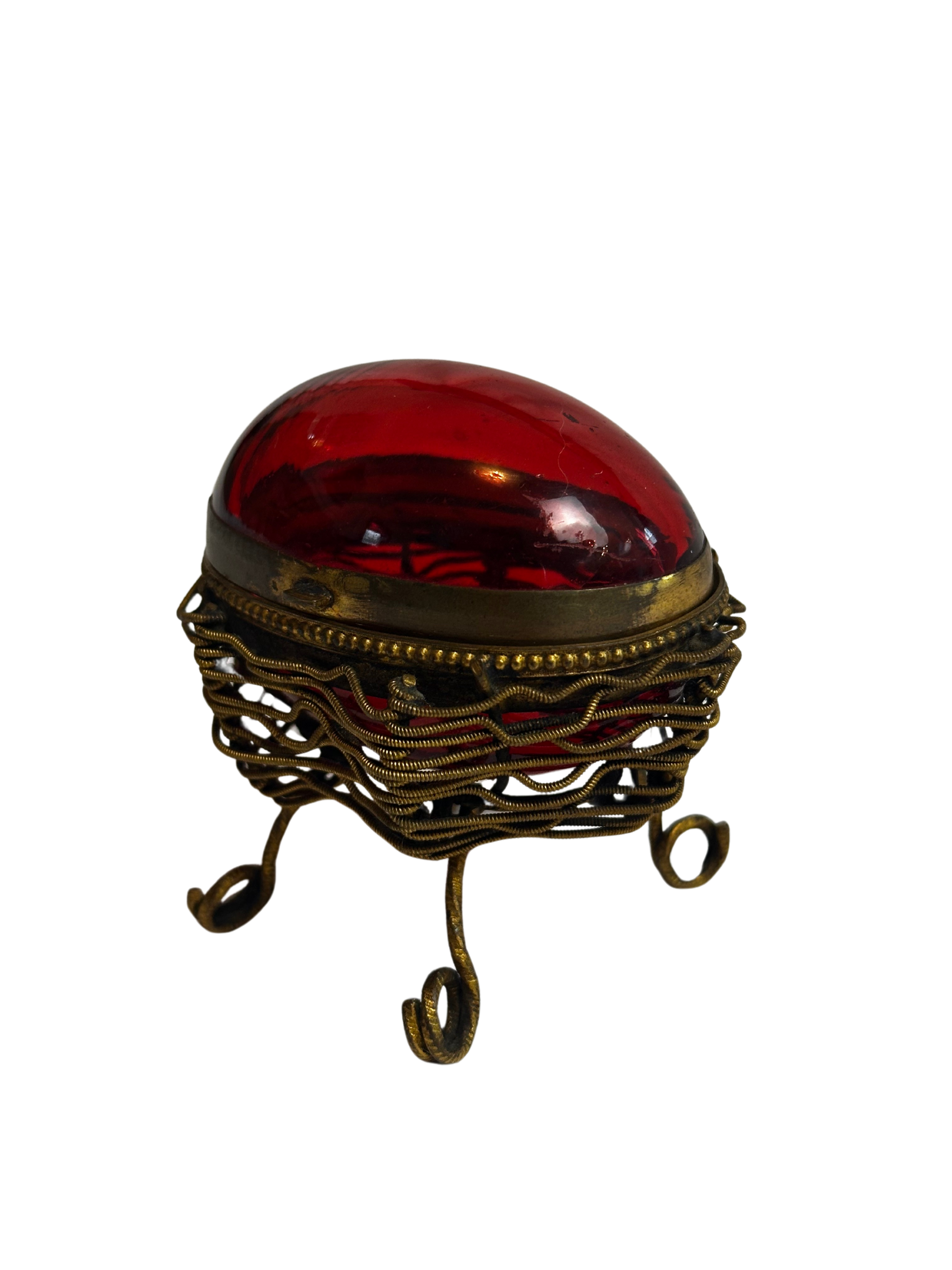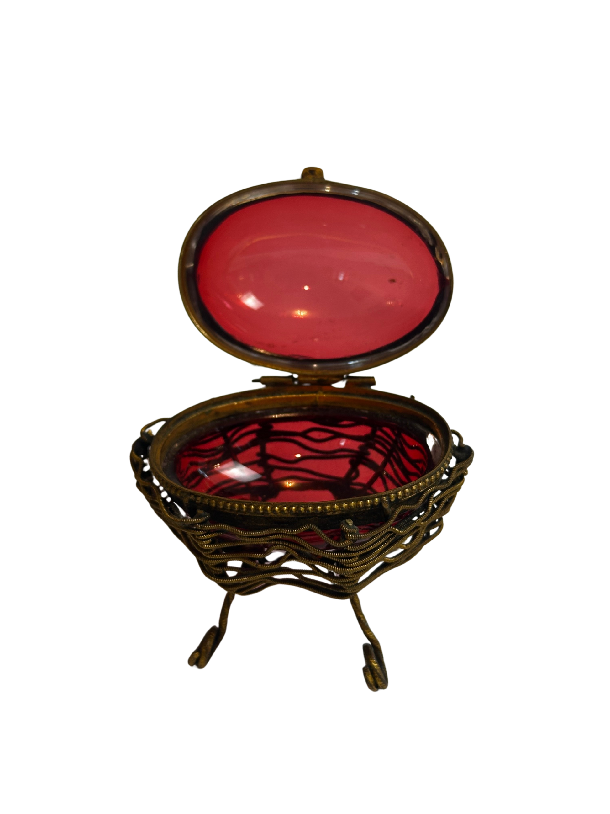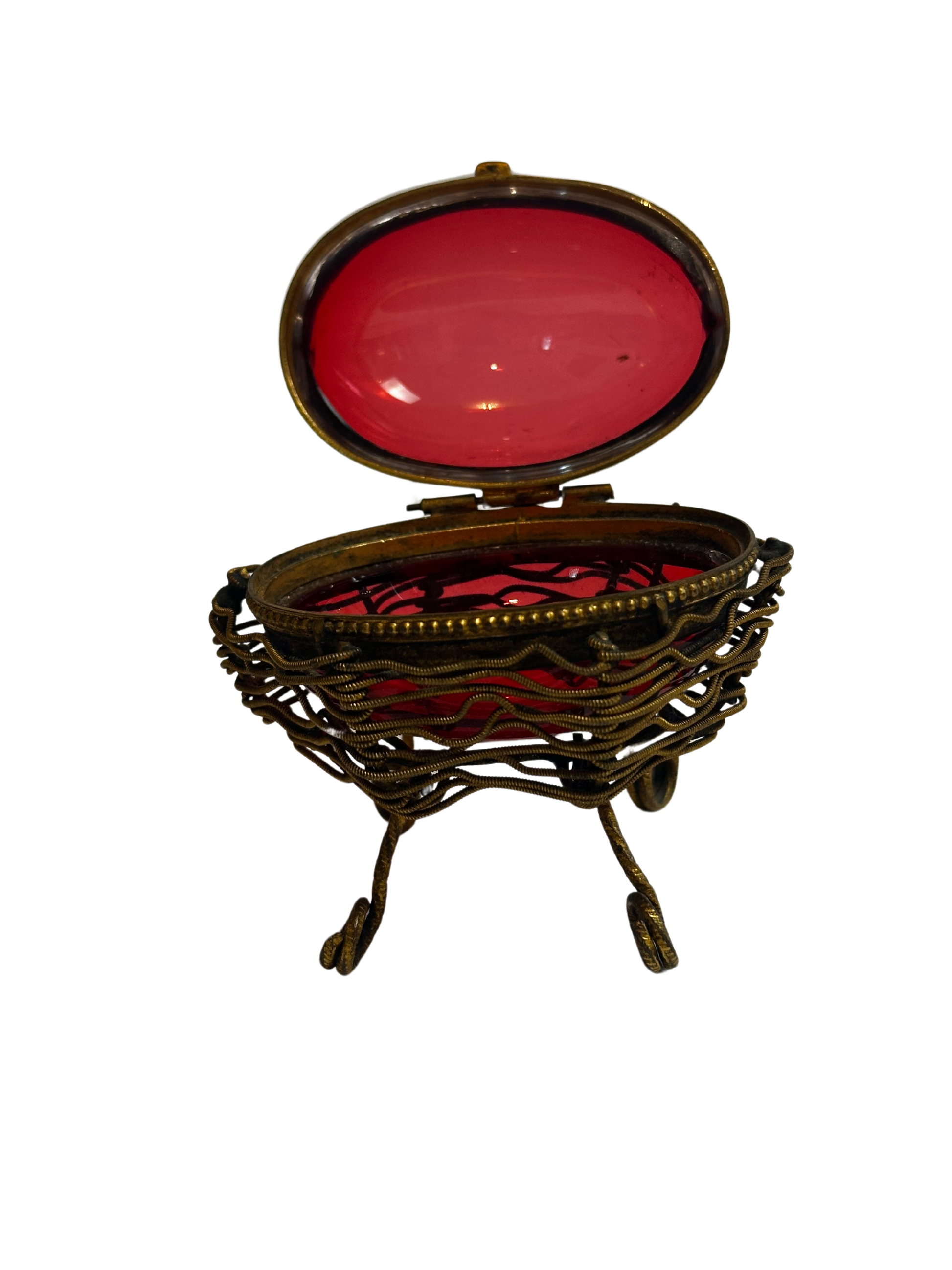 A stunning late 19th-century miniature French casket box crafted in the shape of an egg, featuring deep cranberry glass panels and a swirling ormolu (gilded bronze) wirework frame, raised on whimsical scrolled feet. Opens to reveal a vibrant cranberry glass interior.
