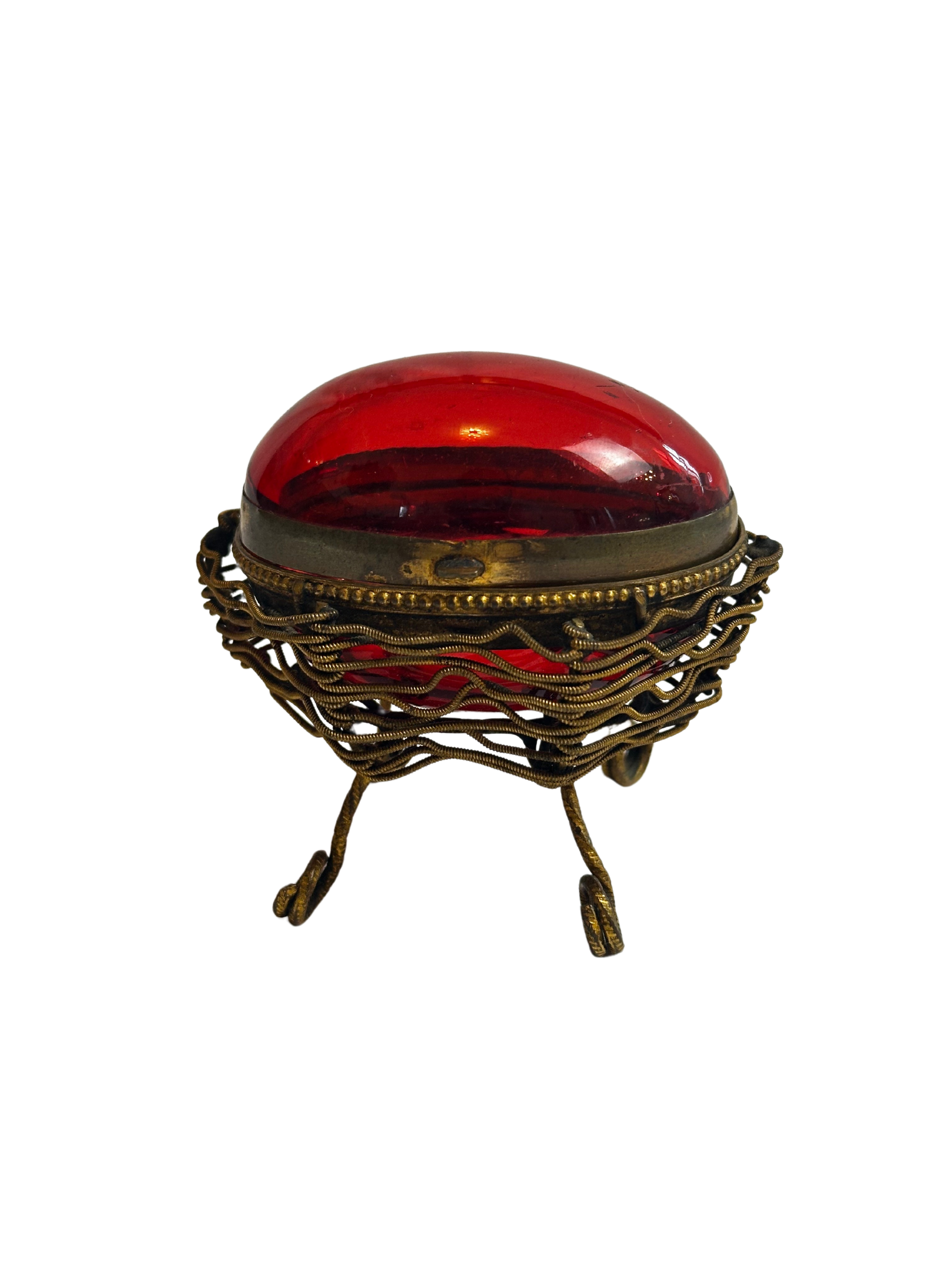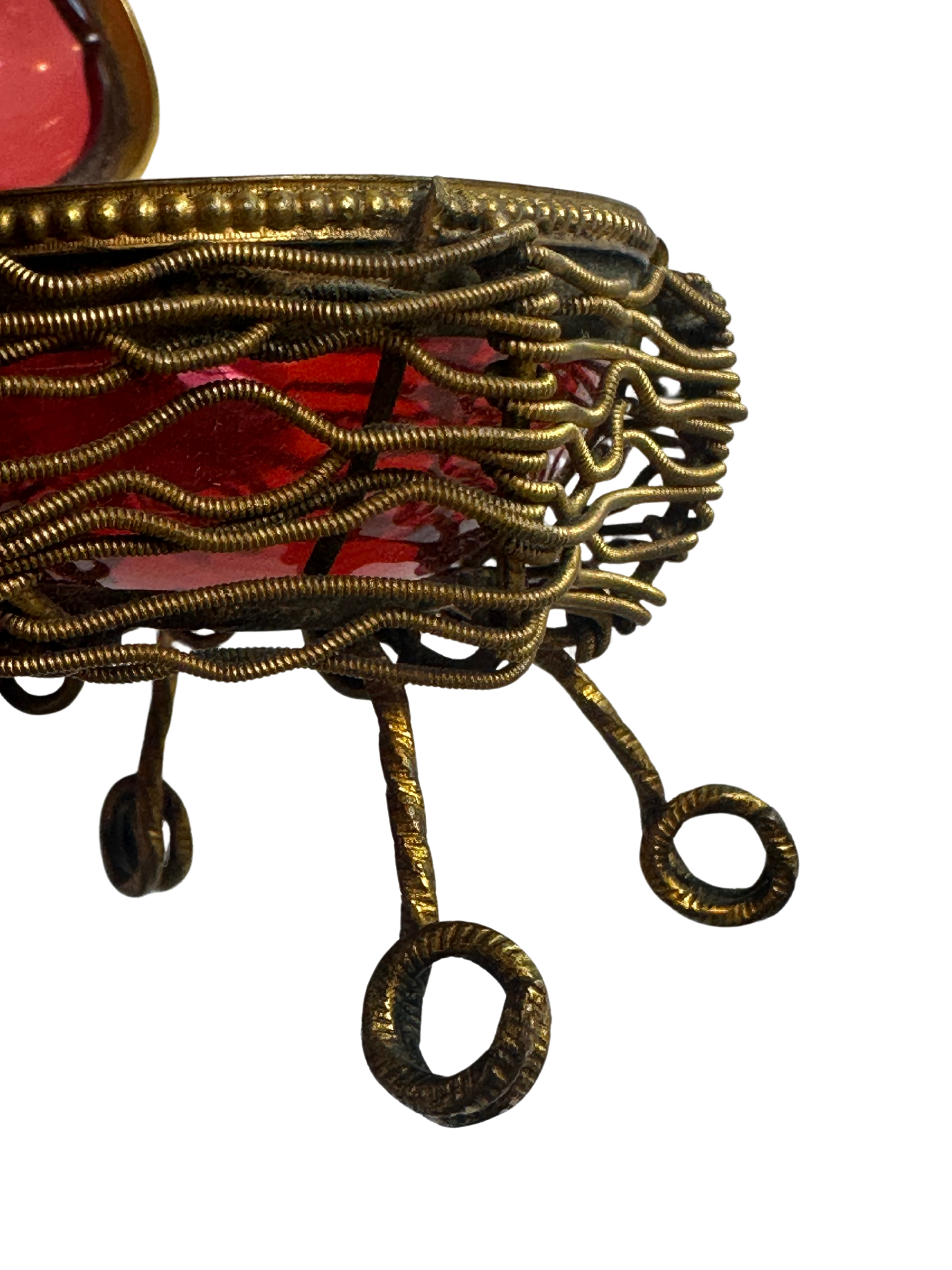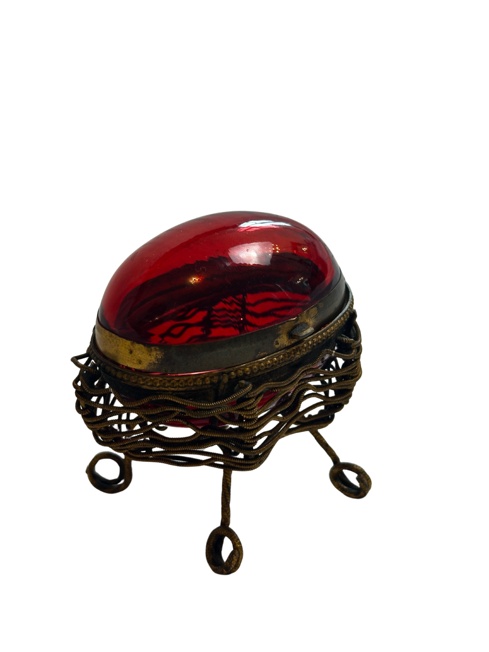 A stunning late 19th-century miniature French casket box crafted in the shape of an egg, featuring deep cranberry glass panels and a swirling ormolu (gilded bronze) wirework frame, raised on whimsical scrolled feet. Opens to reveal a vibrant cranberry glass interior.