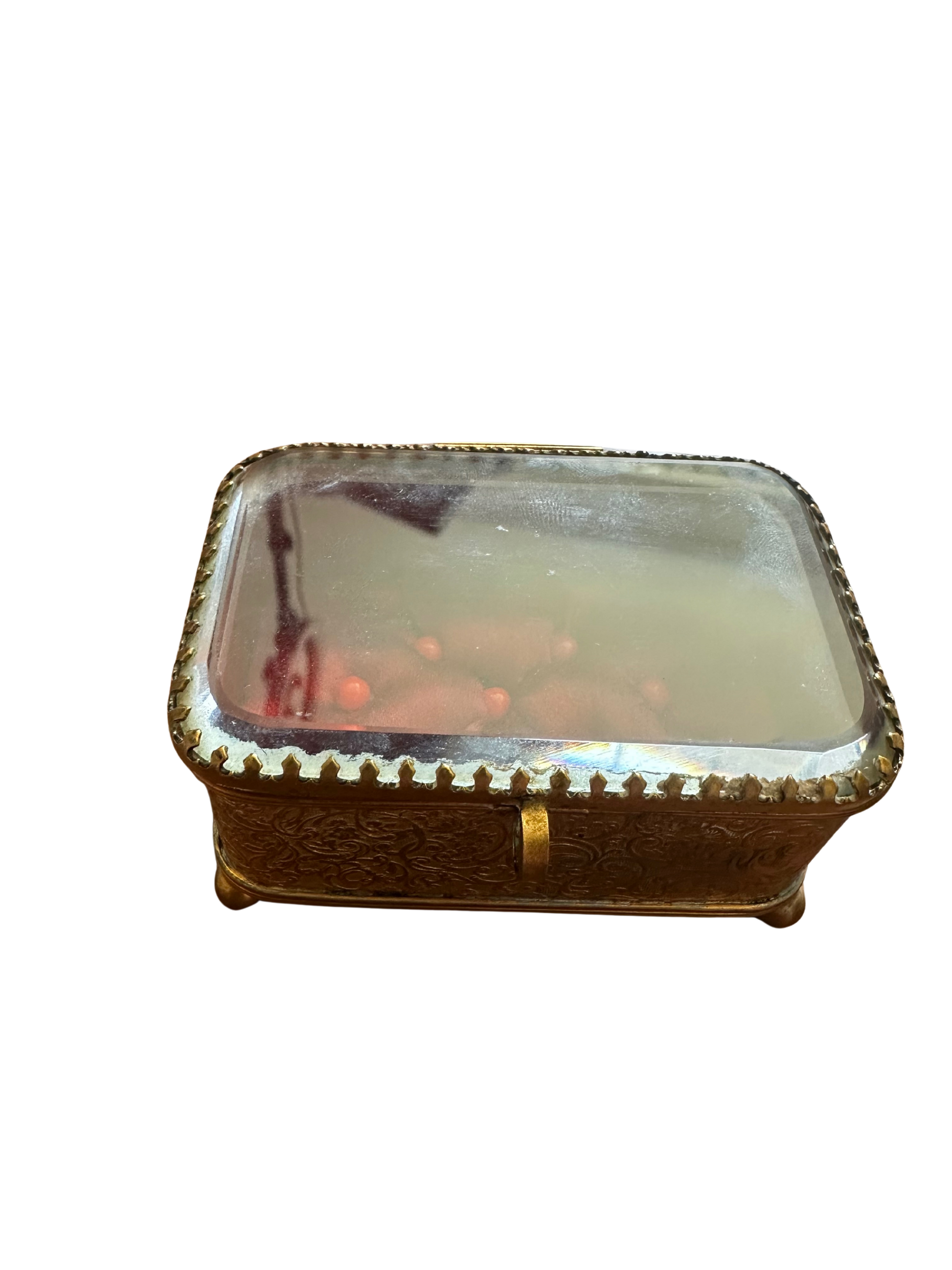Small Ormolu French Jewelry Box with Beveled Glass Top and Red Tufted Silk Interior