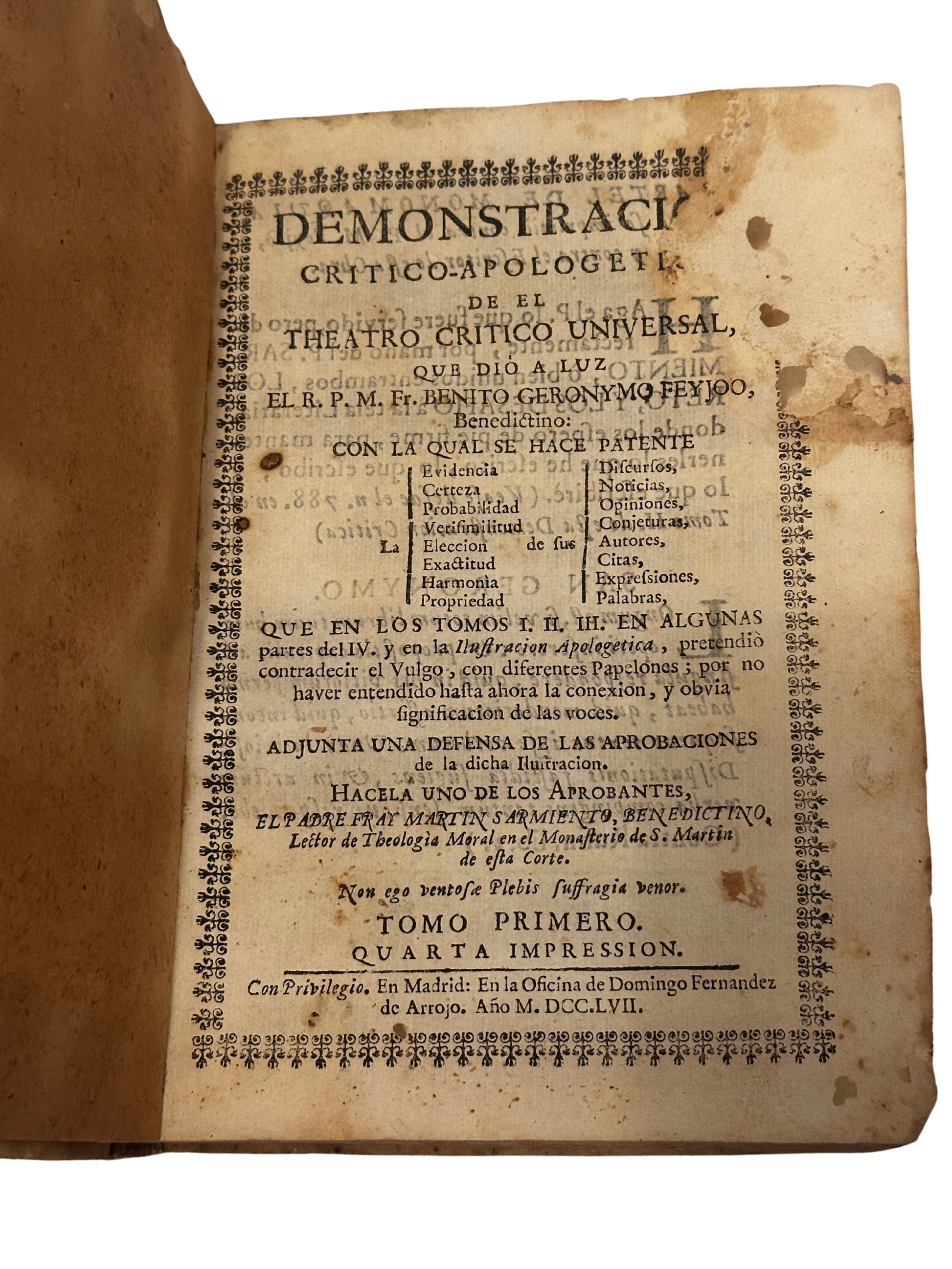 Vellum "Demonstracion Critico-Apolgetica de el Theatro Critico Universal" by Benito Jeronimo Feijoo (1757)