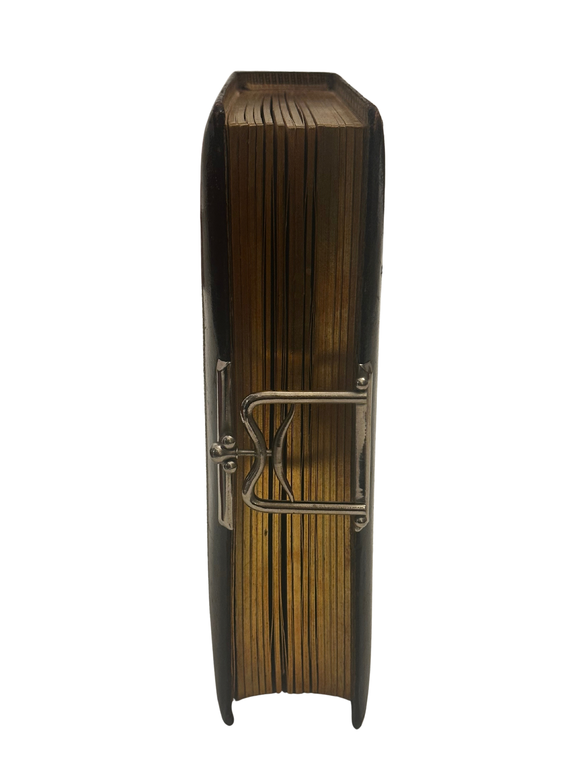 Wear consistent with age and handling. Some page toning, spotting, and minor tears present. Several photographs remain. Binding remains intact and clasp functional.