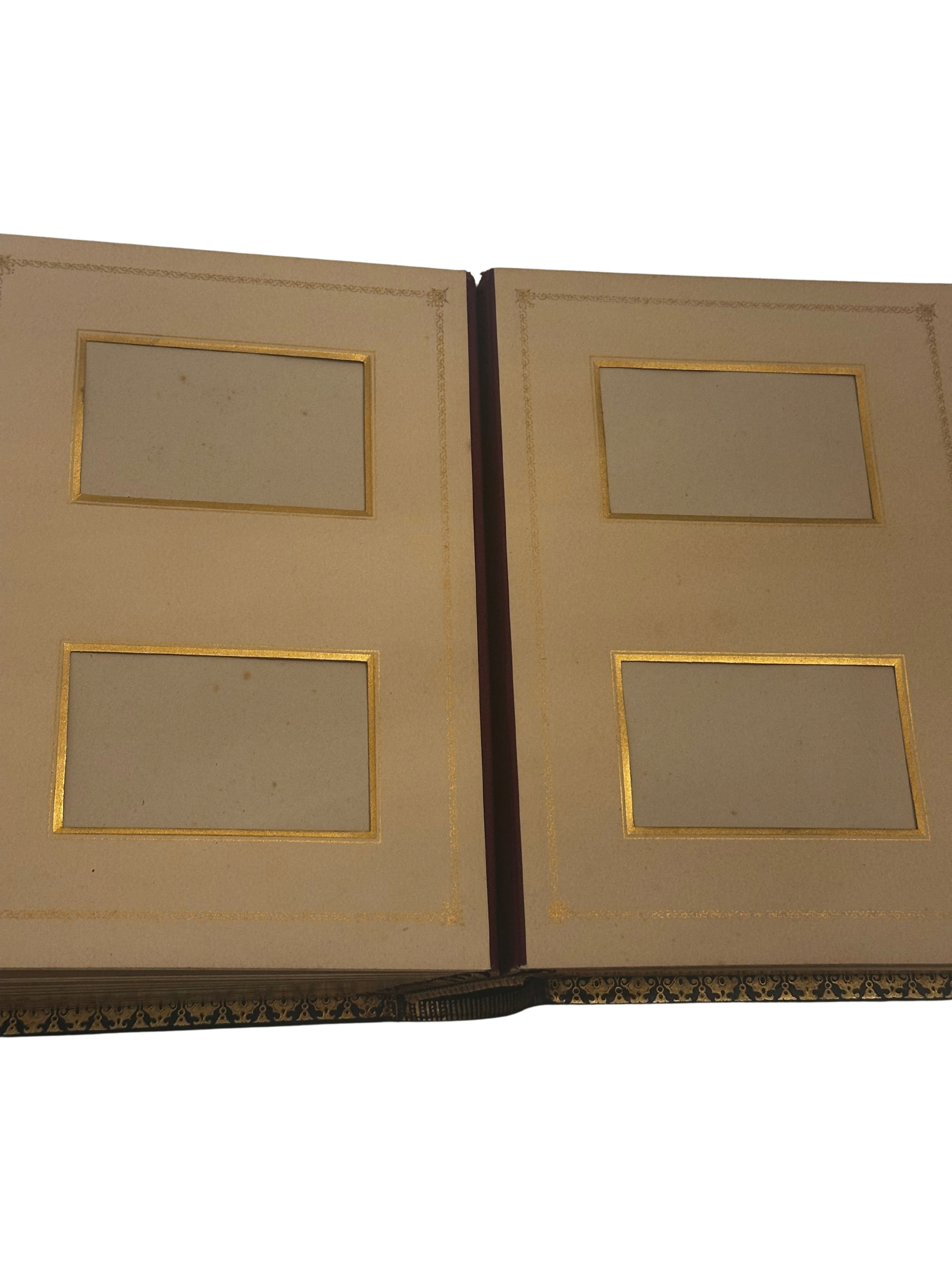 The album contains thick card pages with gilt-ruled photographic windows designed for carte-de-visite and cabinet photographs, a popular photographic format of the late 19th century. The page edges are beautifully gilt-edged, giving the album a refined presentation typical of middle-to-upper-class family photograph albums of the period.