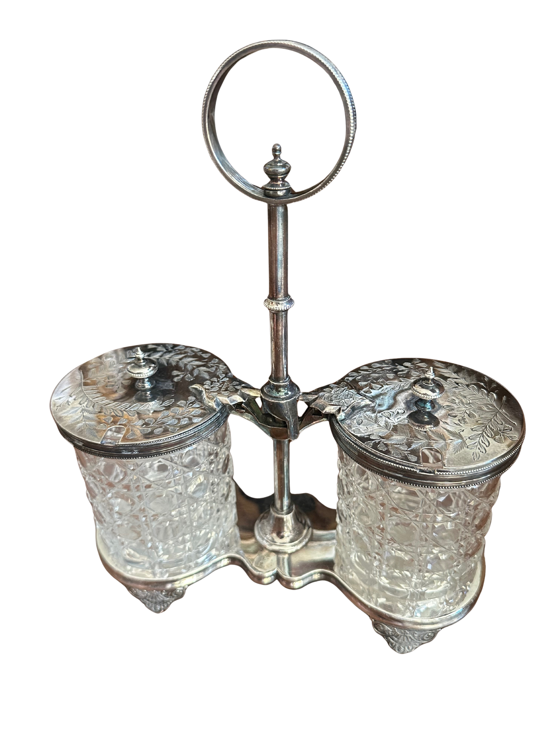 Victorian Silver Plate and Cut Glass Double Condiment Server with Mechanical Lids