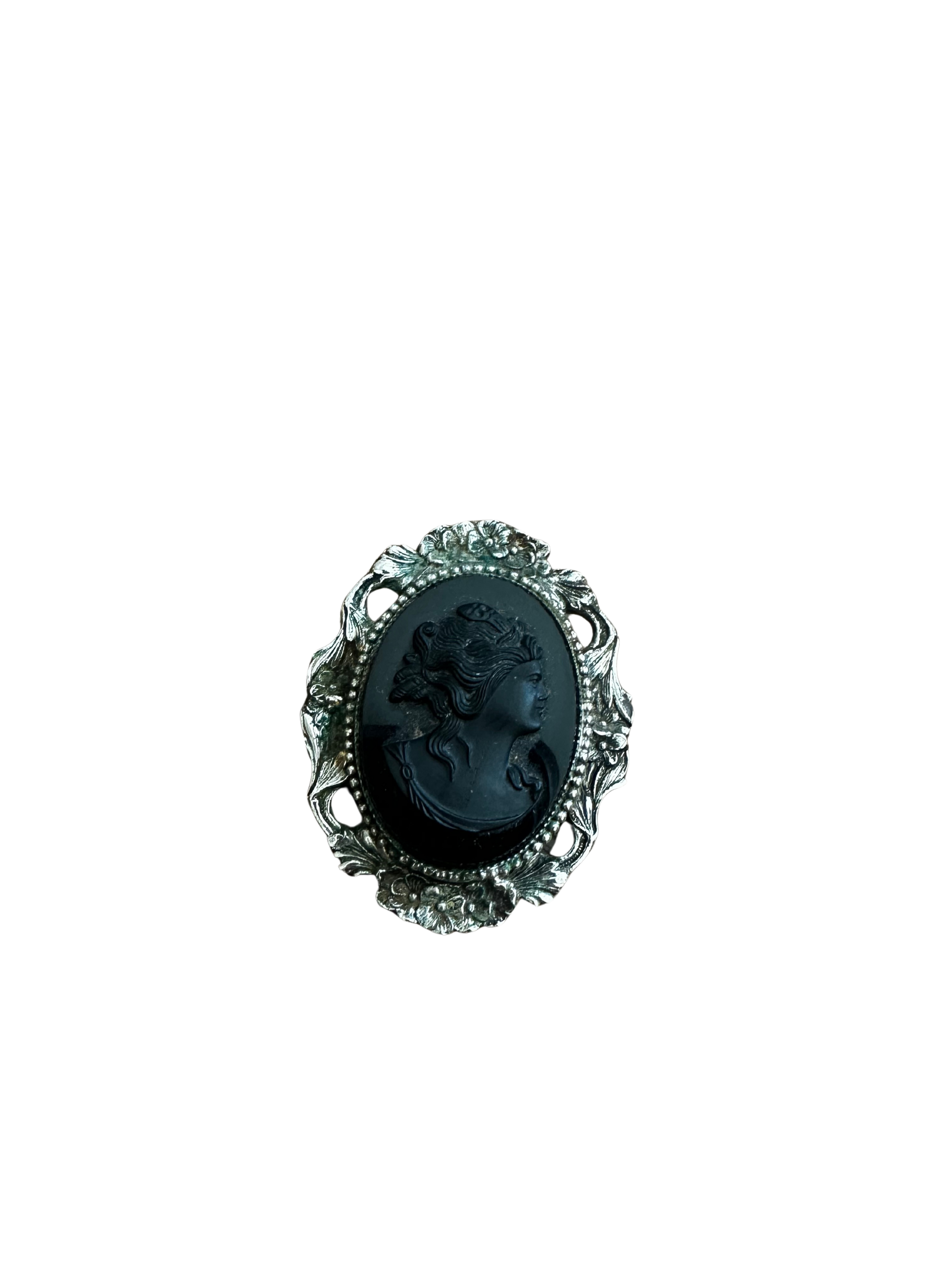 Vintage Neoclassical Style Black and Silver Cameo Brooch
