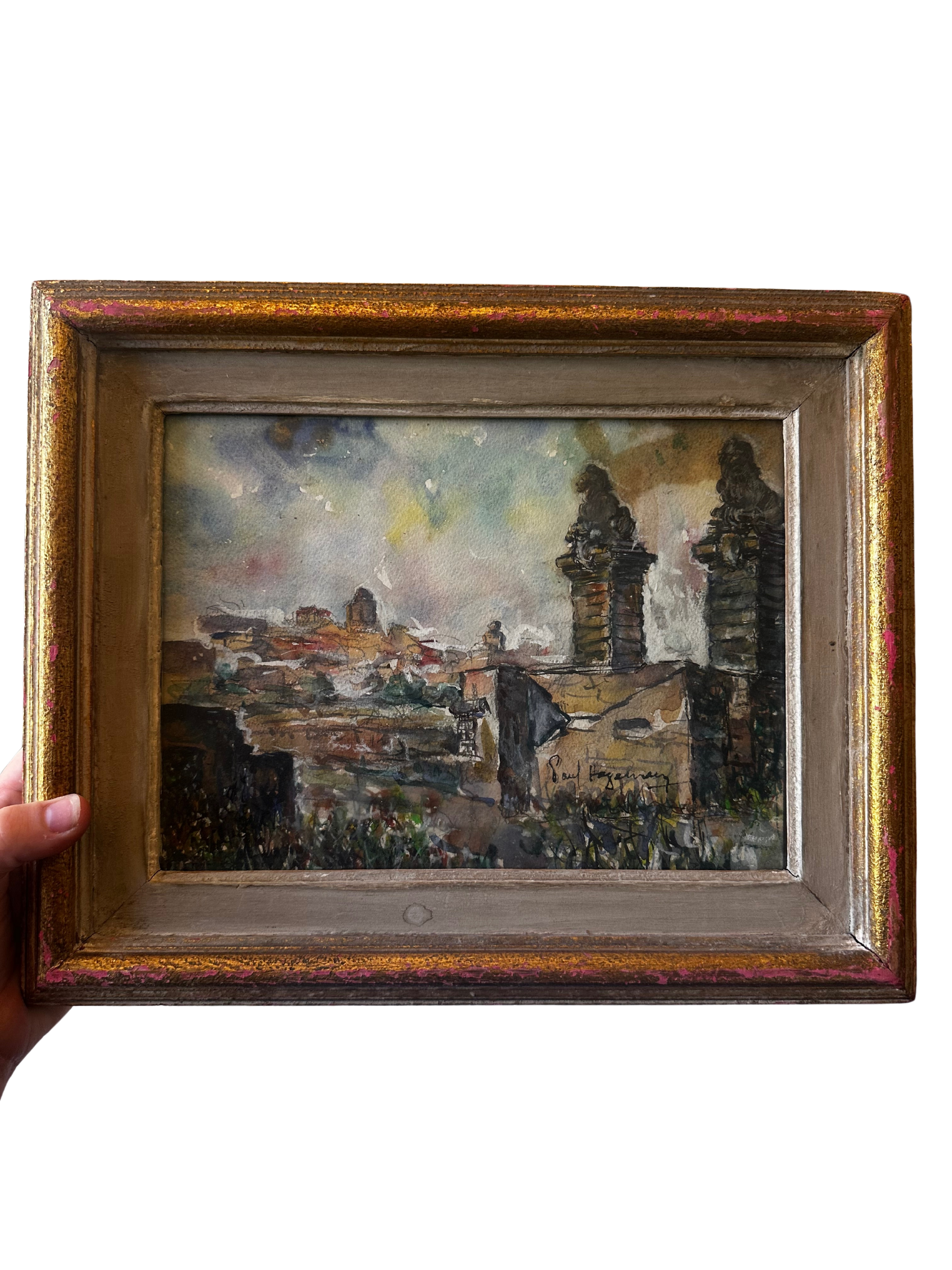 Watercolor on Paper of Cityscape with Lions (Signed Paul Hagmans - Belgian, 1884-1959)